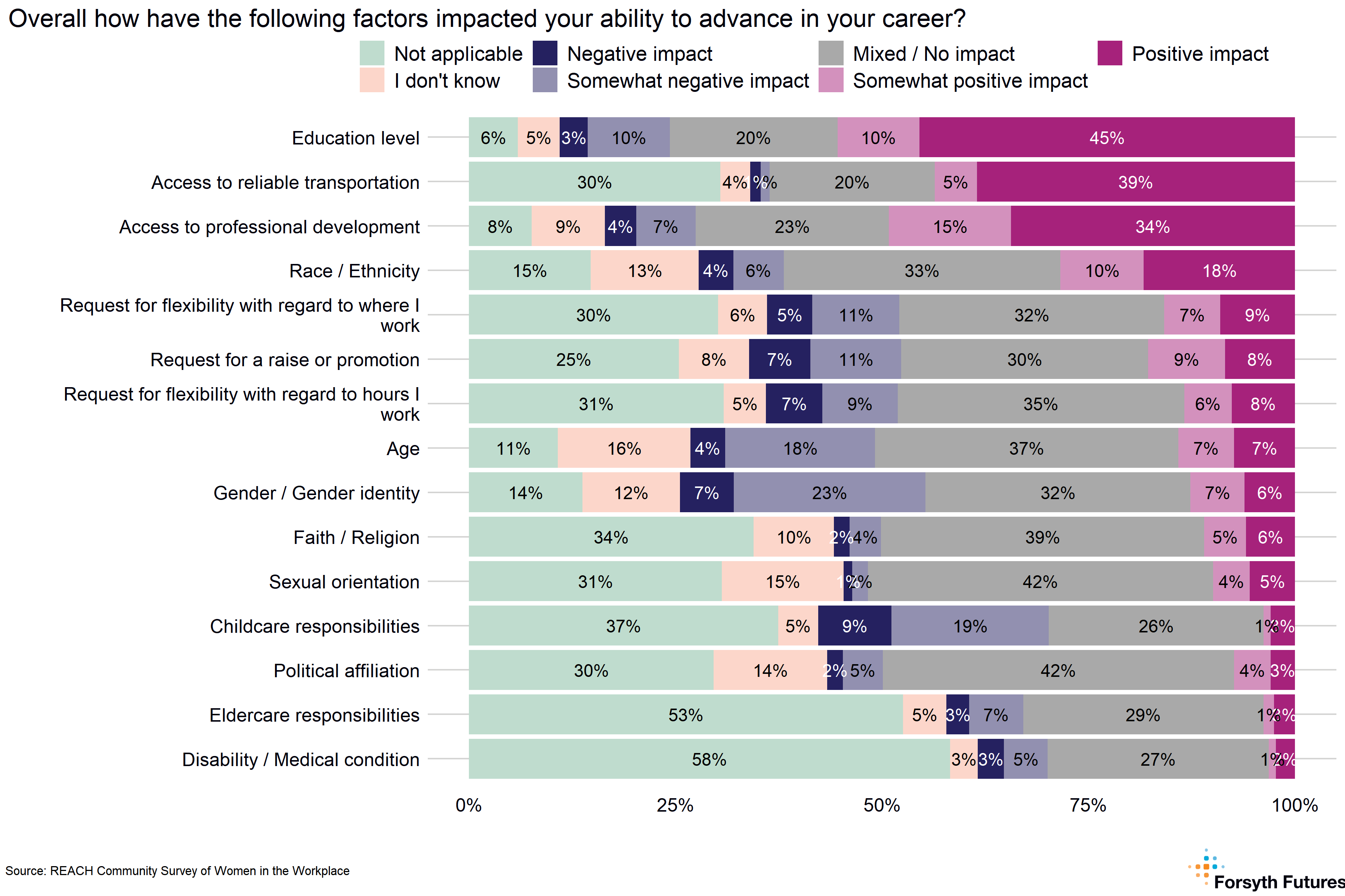 The factors identified as having the most positive impact on women’s career advancement were: access to professional development (49%), access to reliable transportation (44%), and their education level (55%). The factors with the most negative impact on career advancement included gender/gender identity (30%) and childcare responsibilities (28%). More than half of women reported their career advancement has not been impacted by a disability/medical condition (58%) or by eldercare responsibilities (53%).