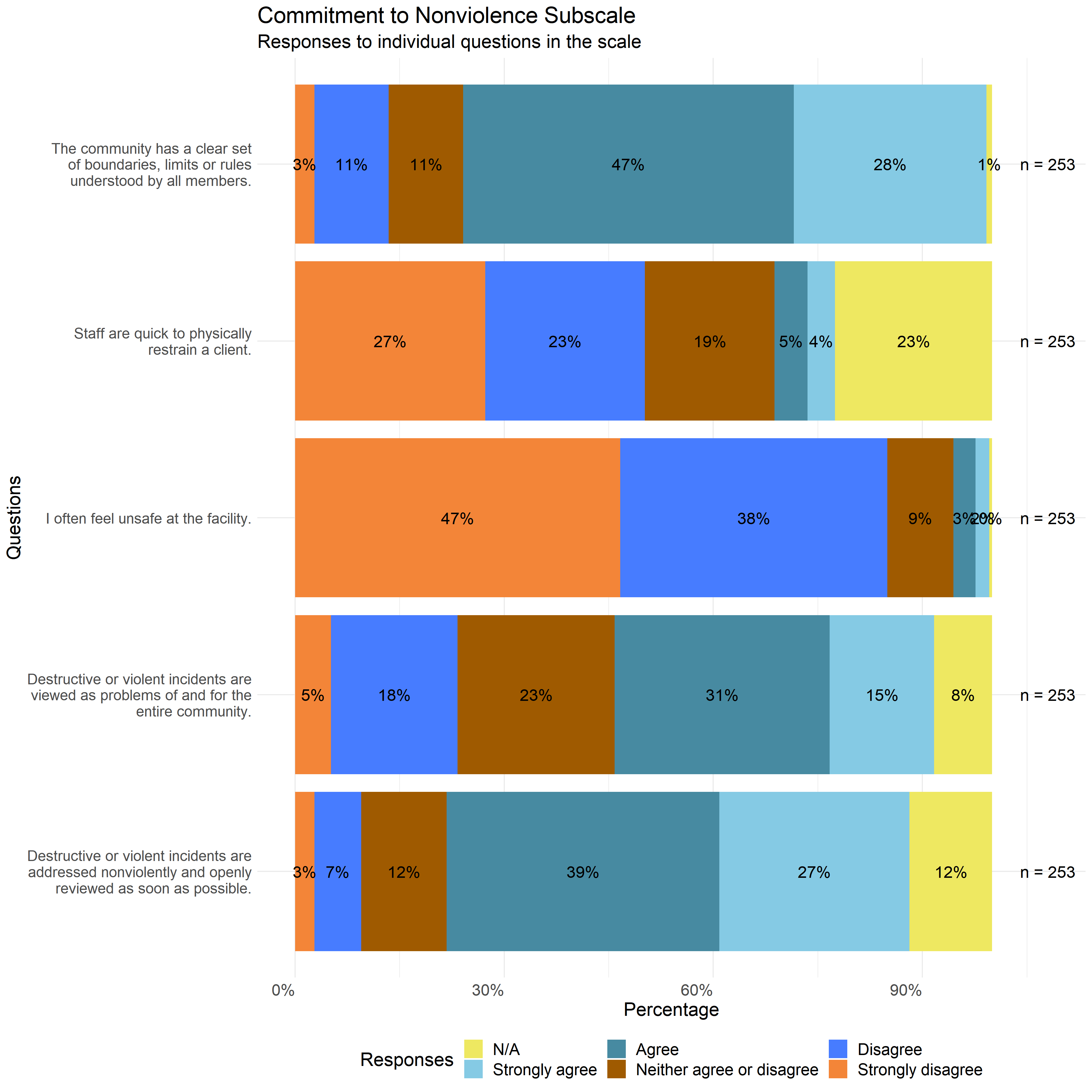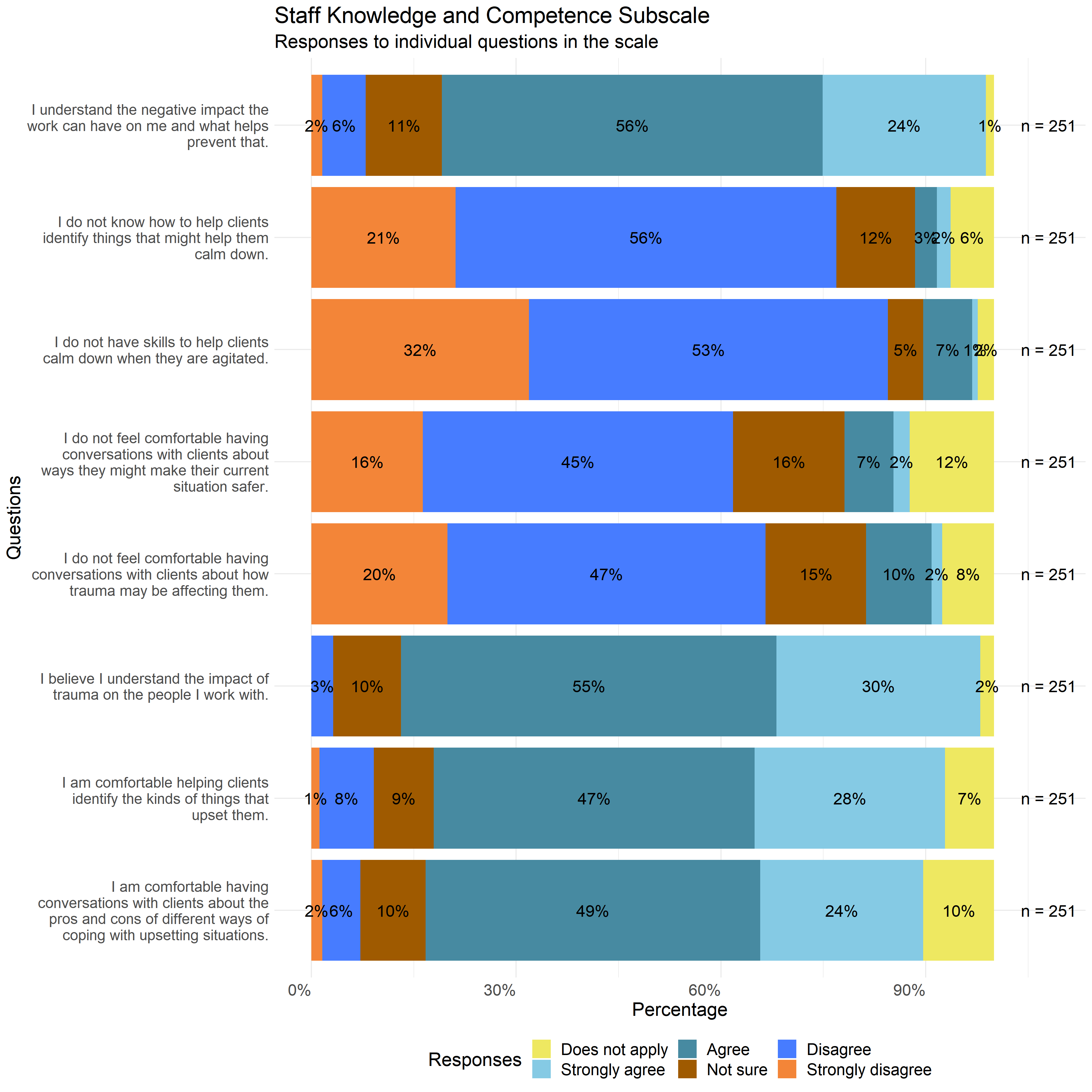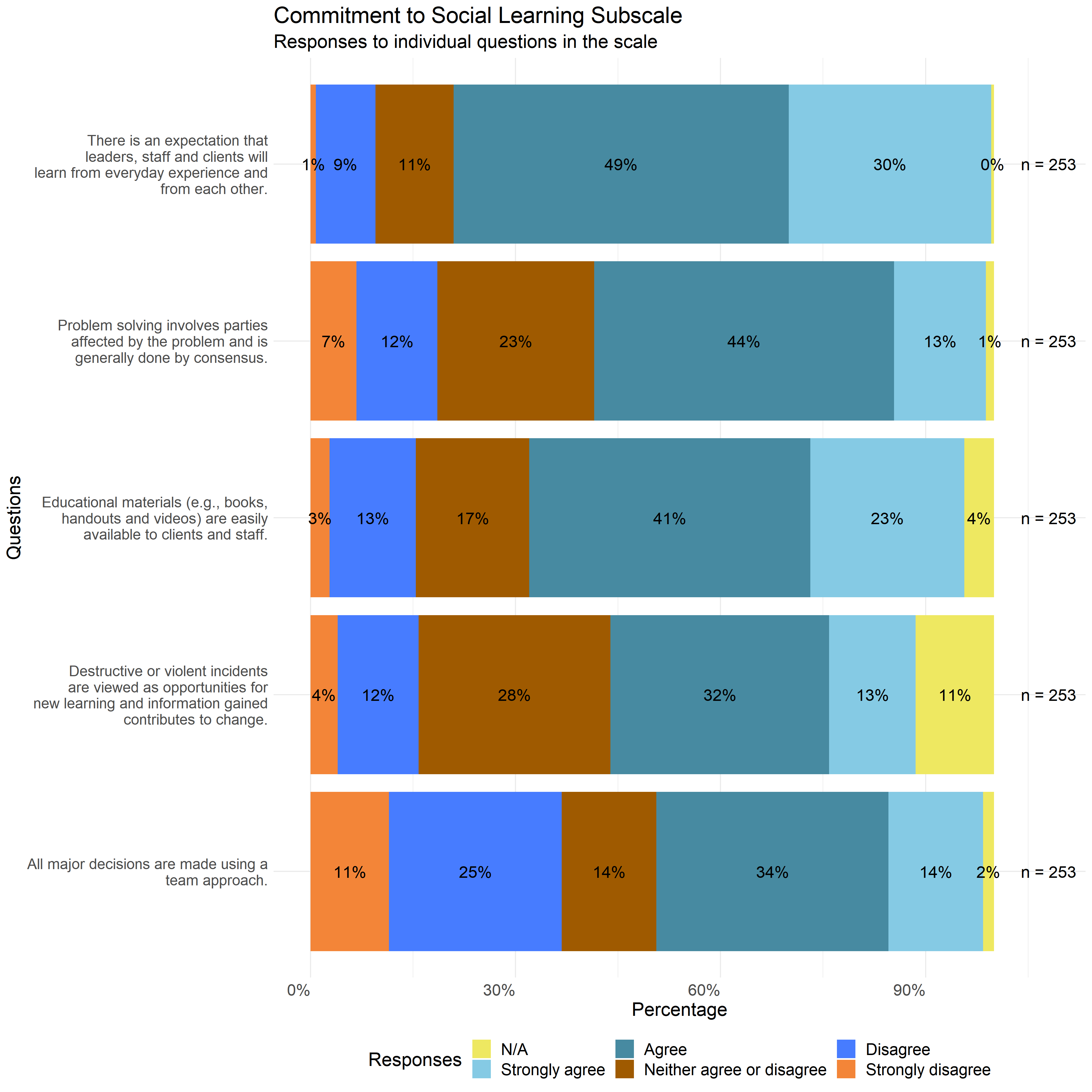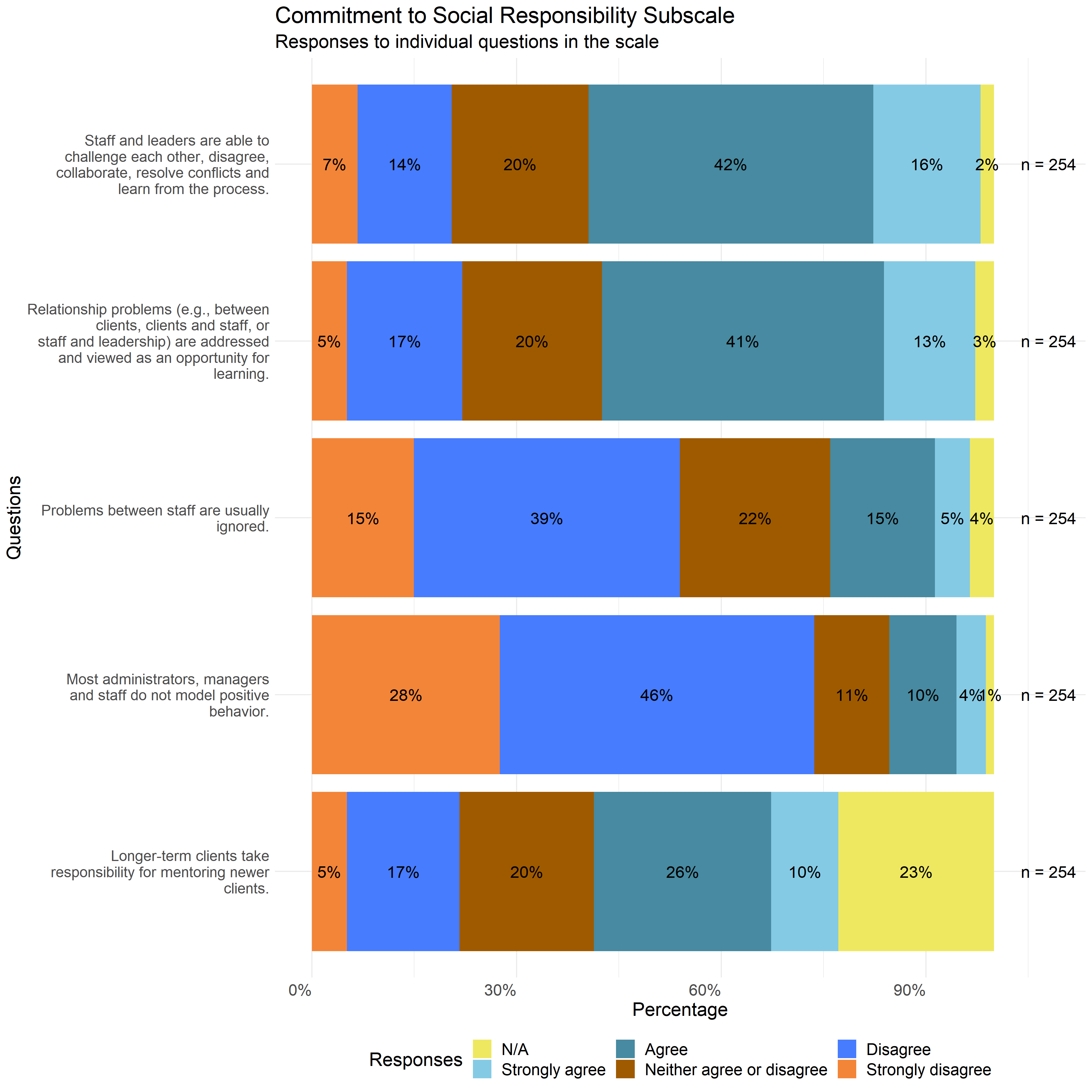 The following graphs show the distribution of responses to the specific survey questions that make up each scale used in this report.