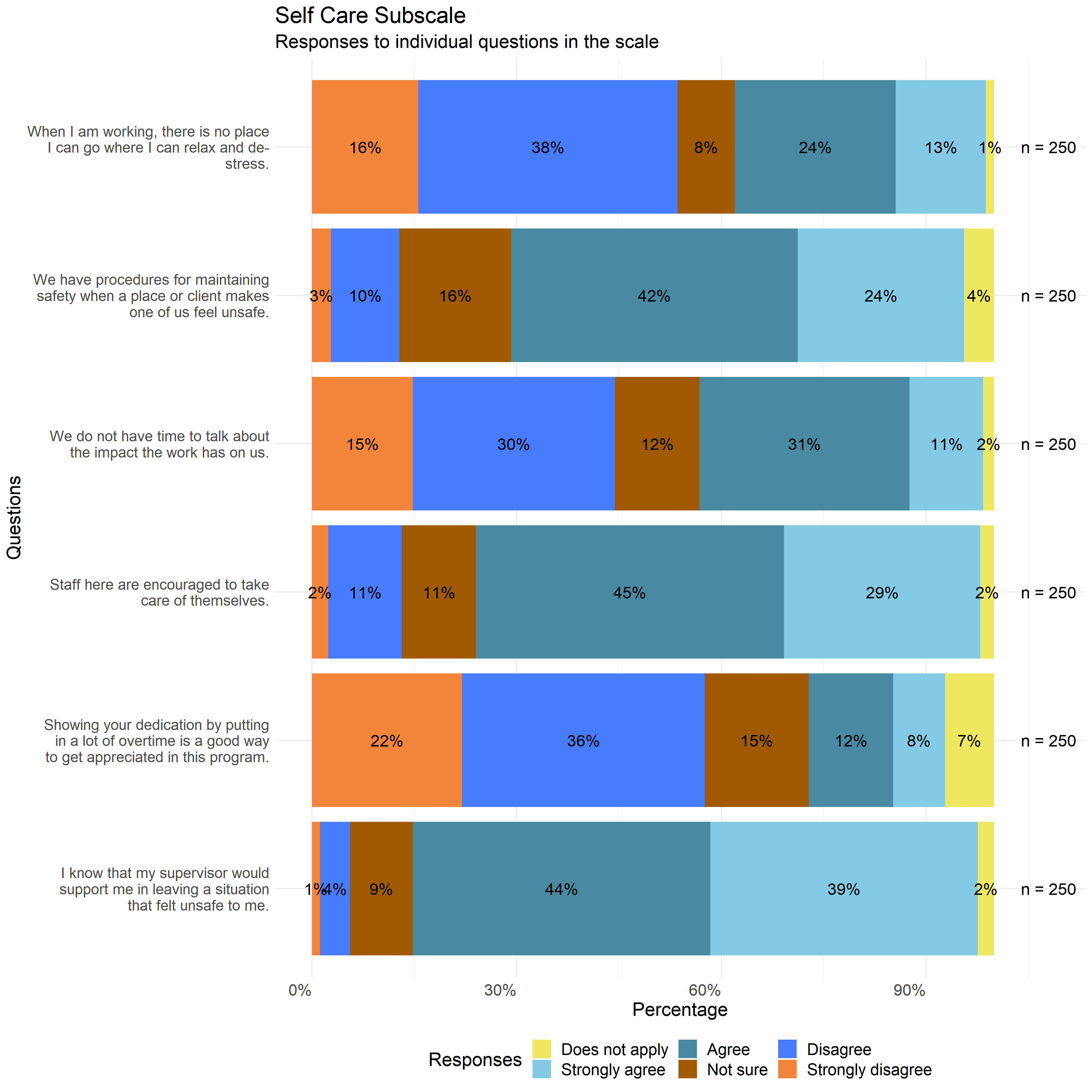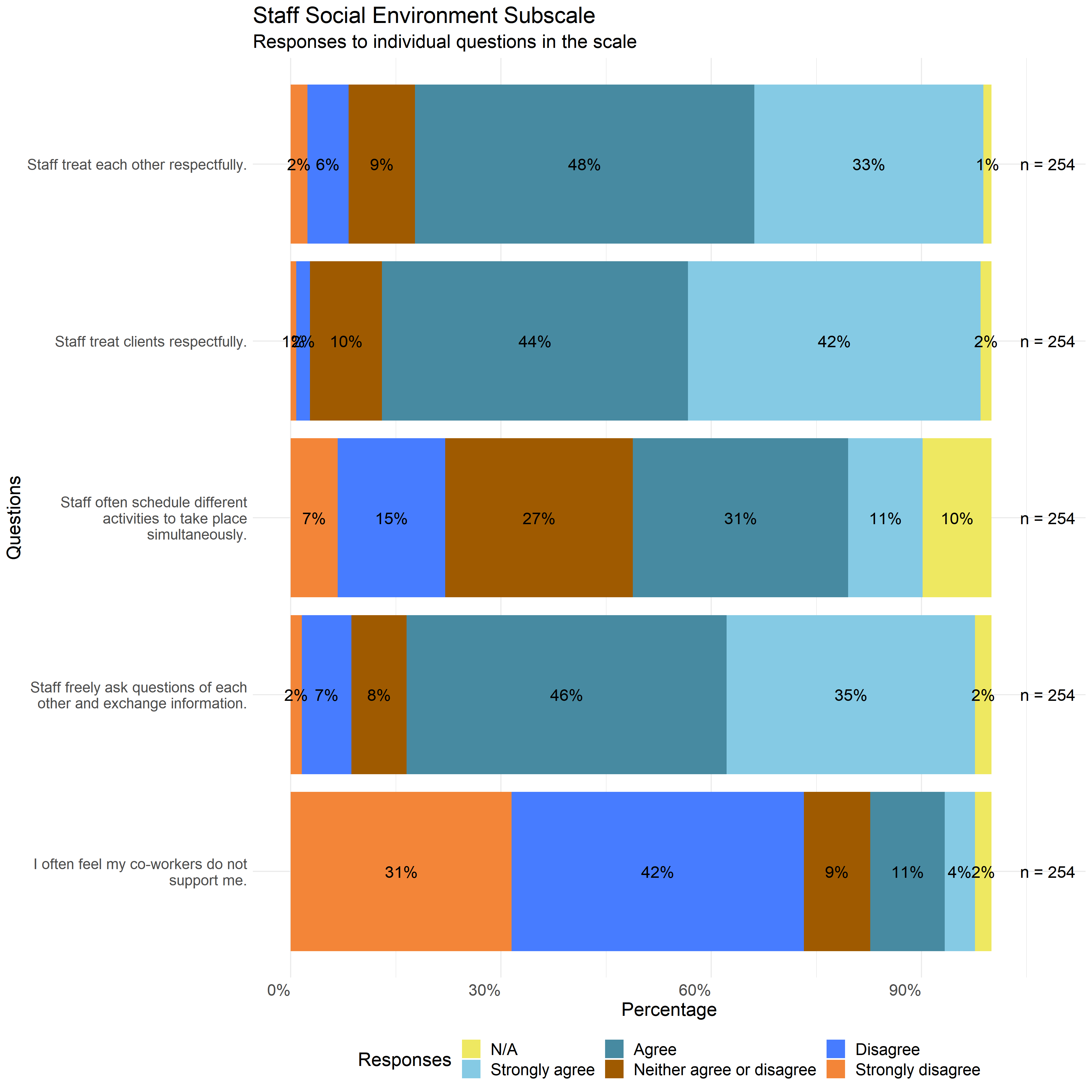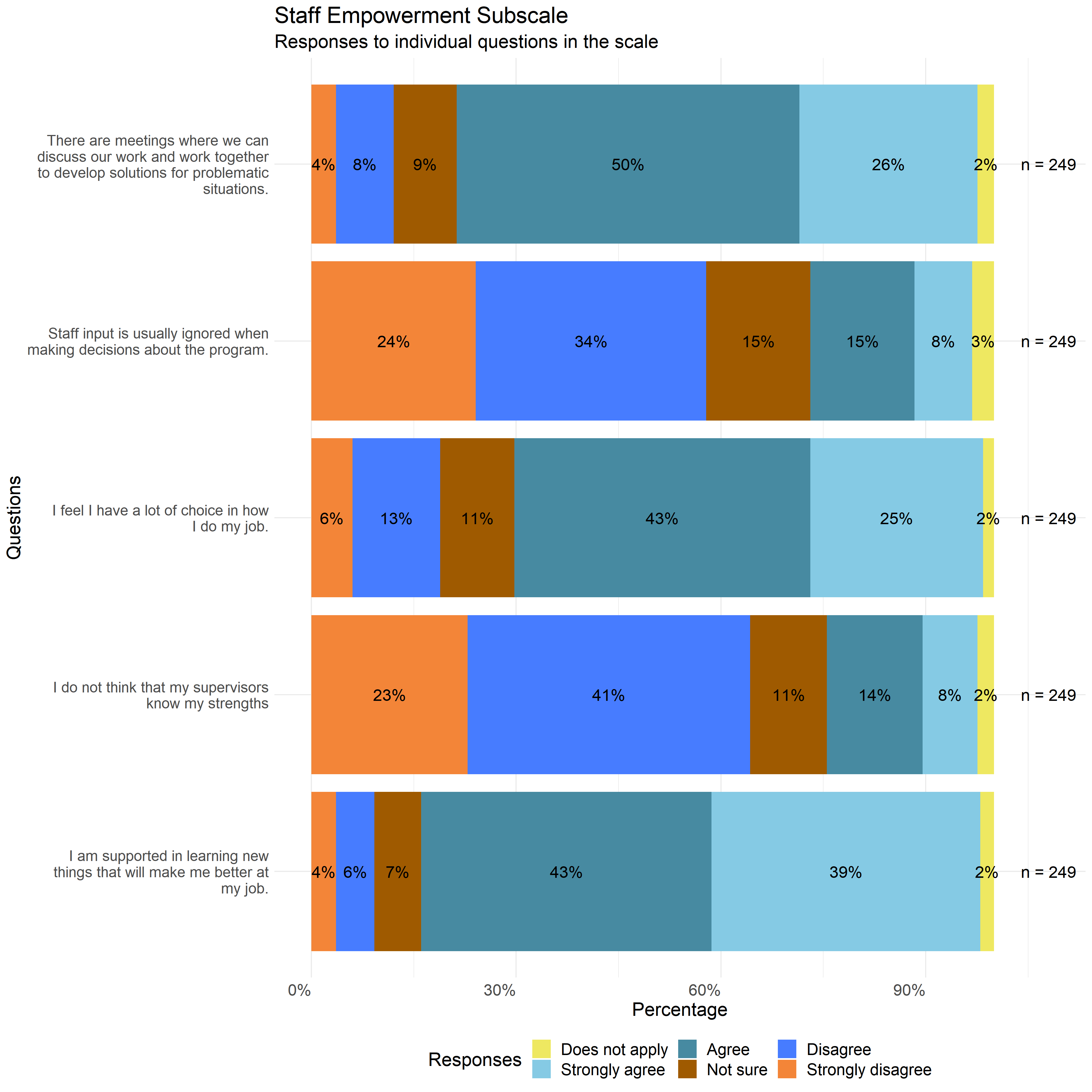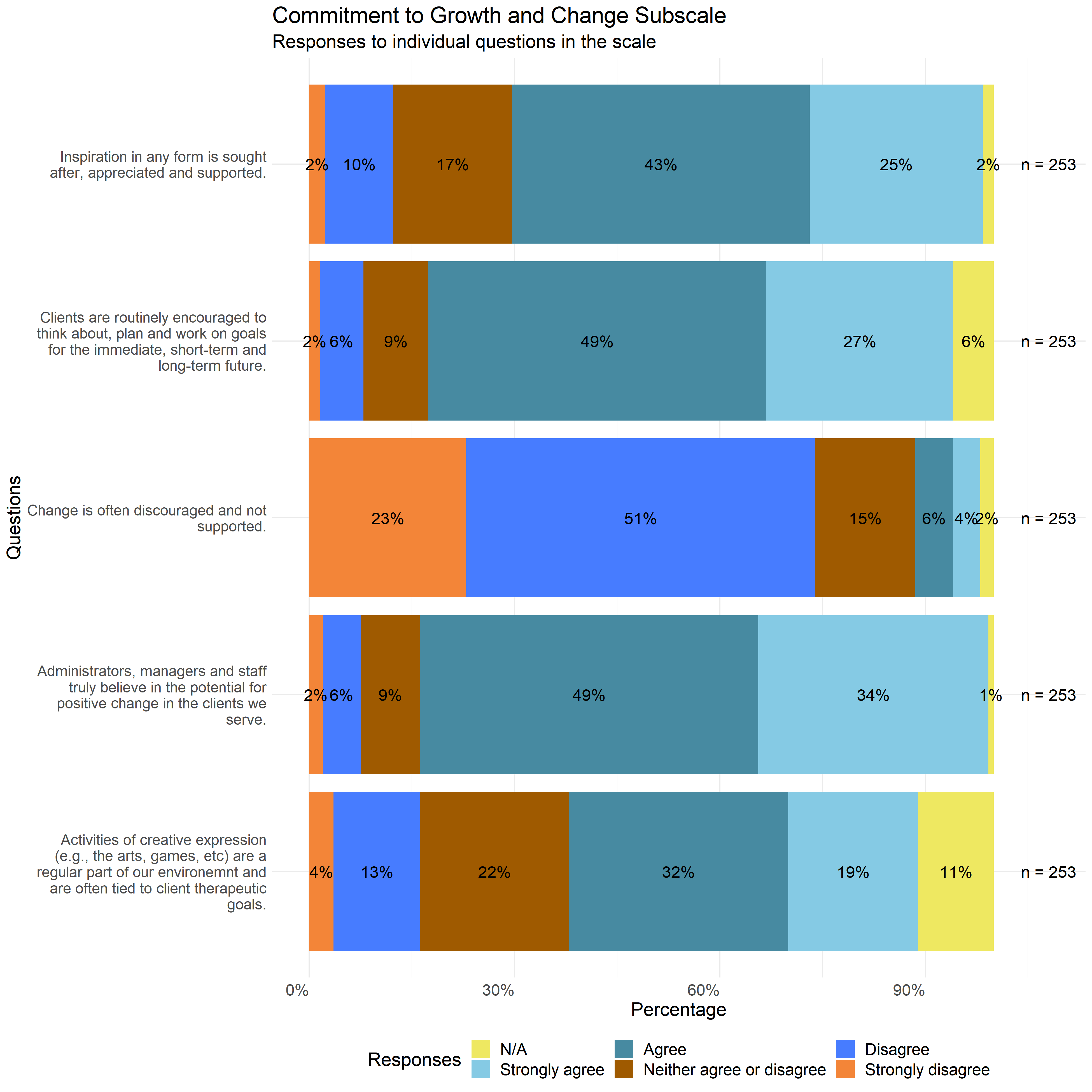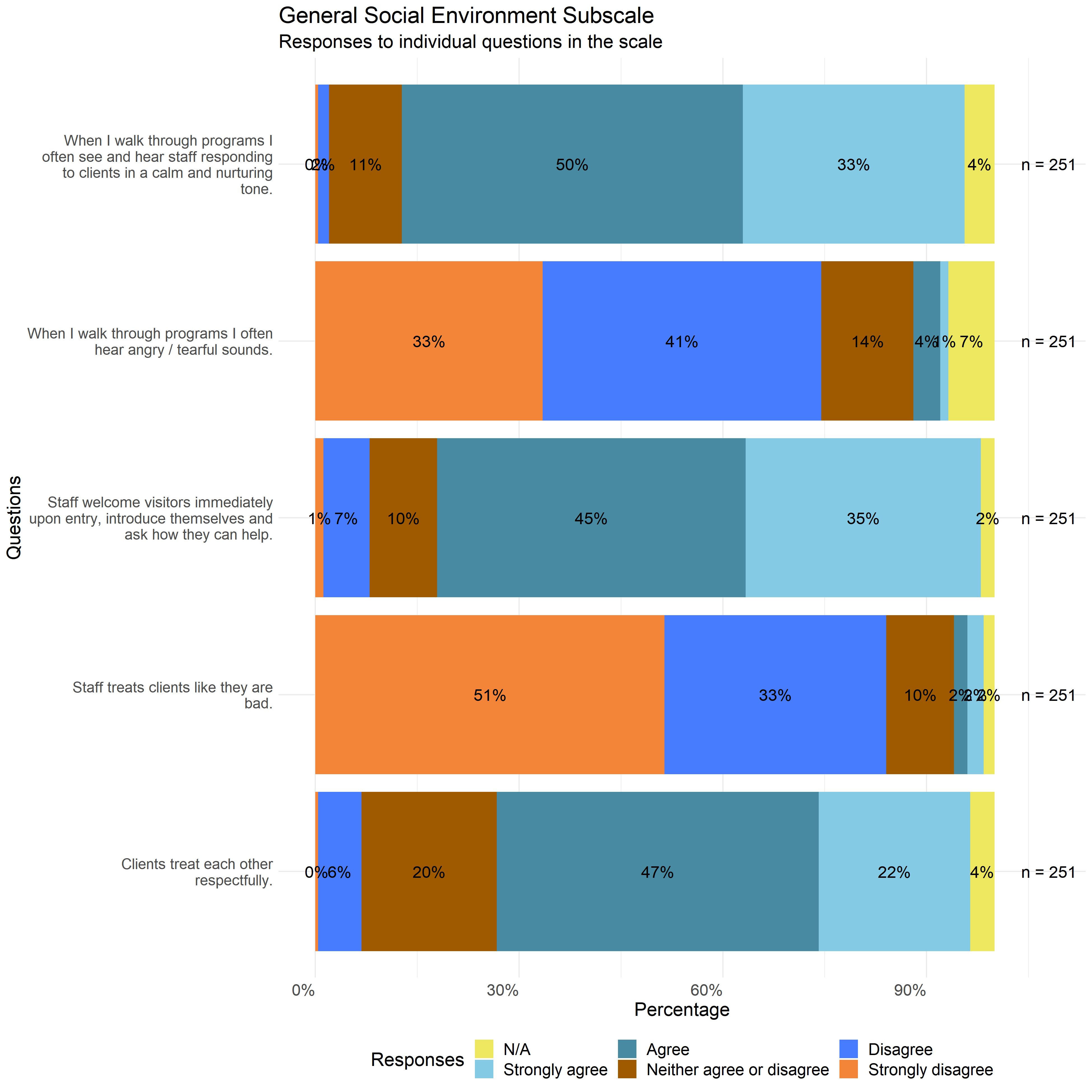 The following graphs show the distribution of responses to the specific survey questions that make up each scale used in this report.