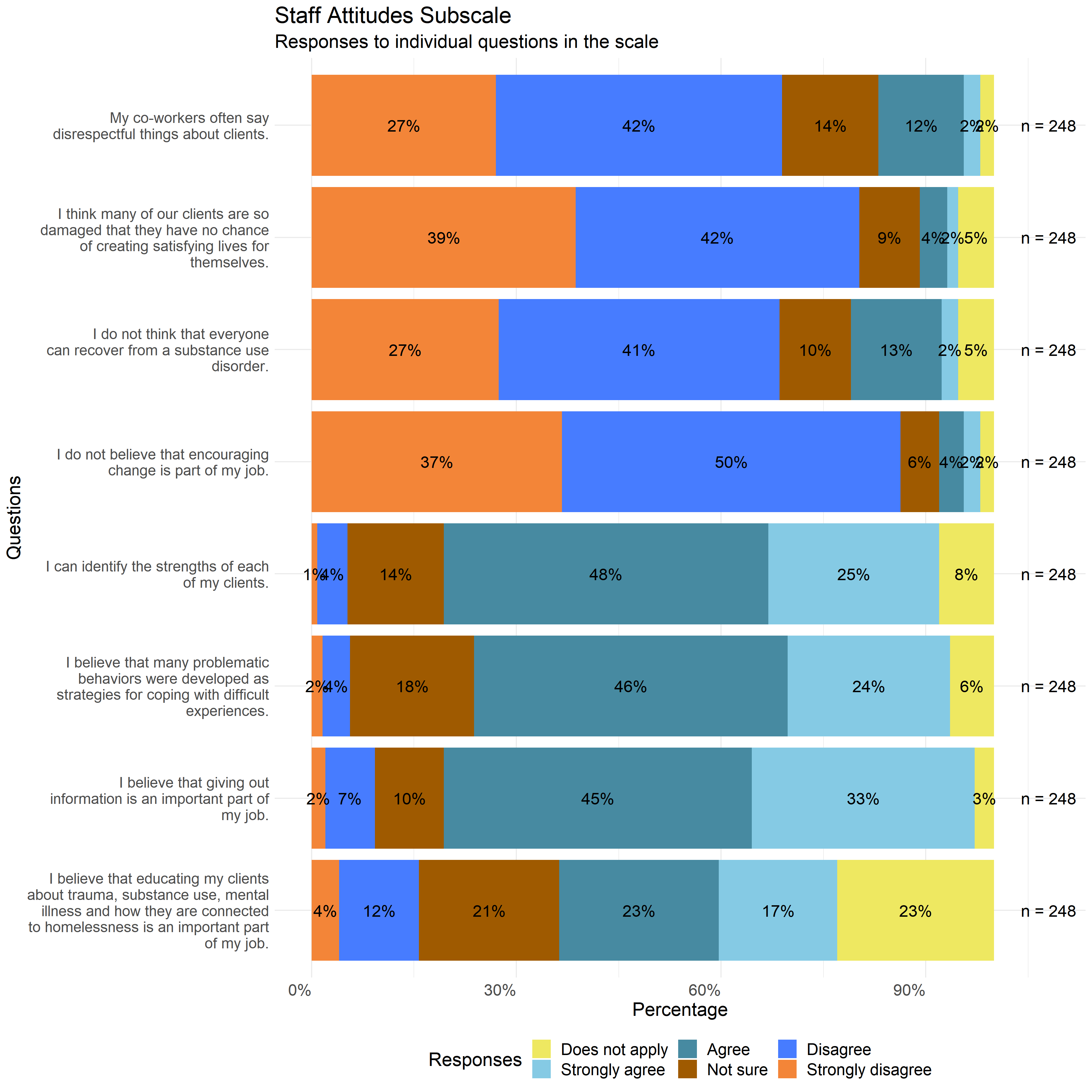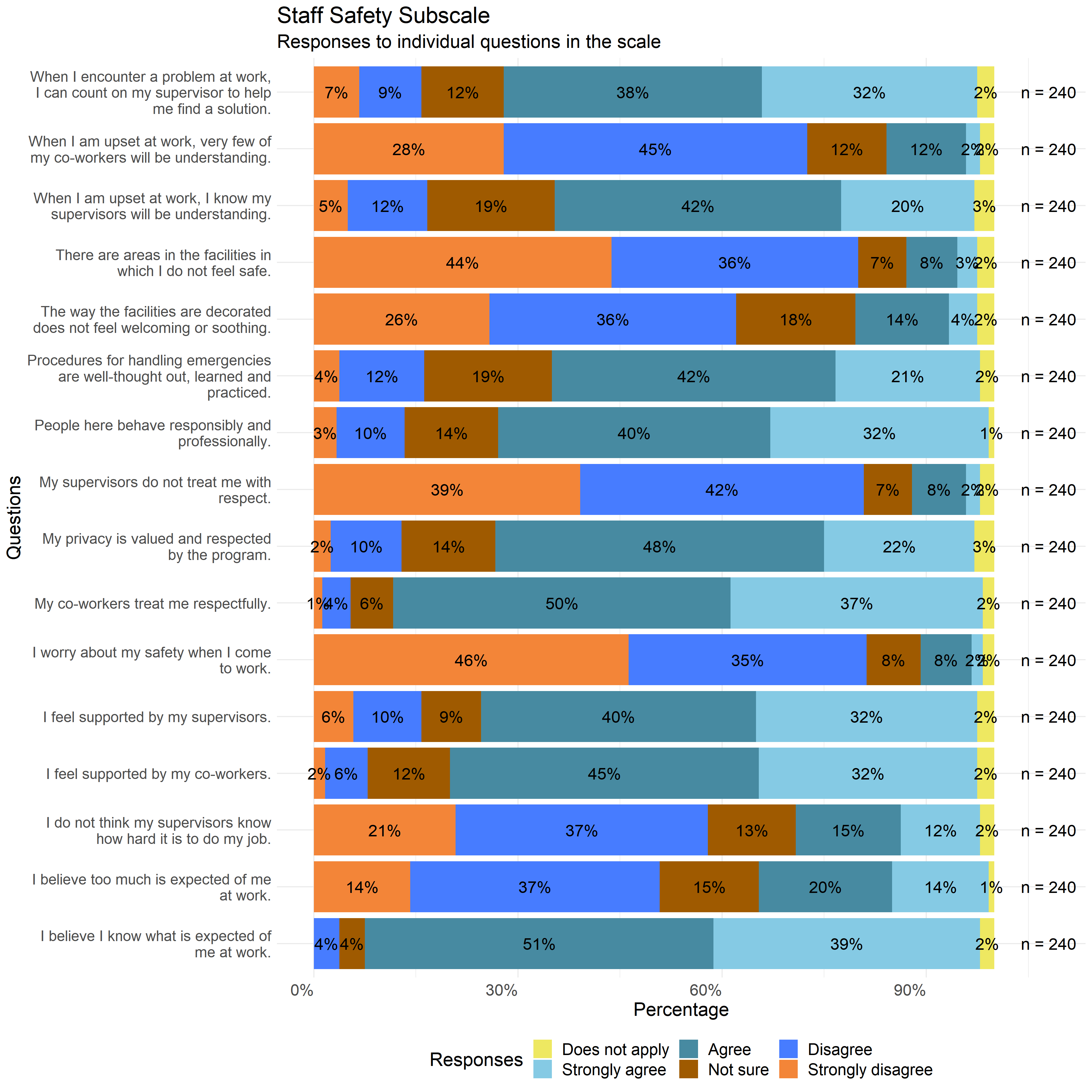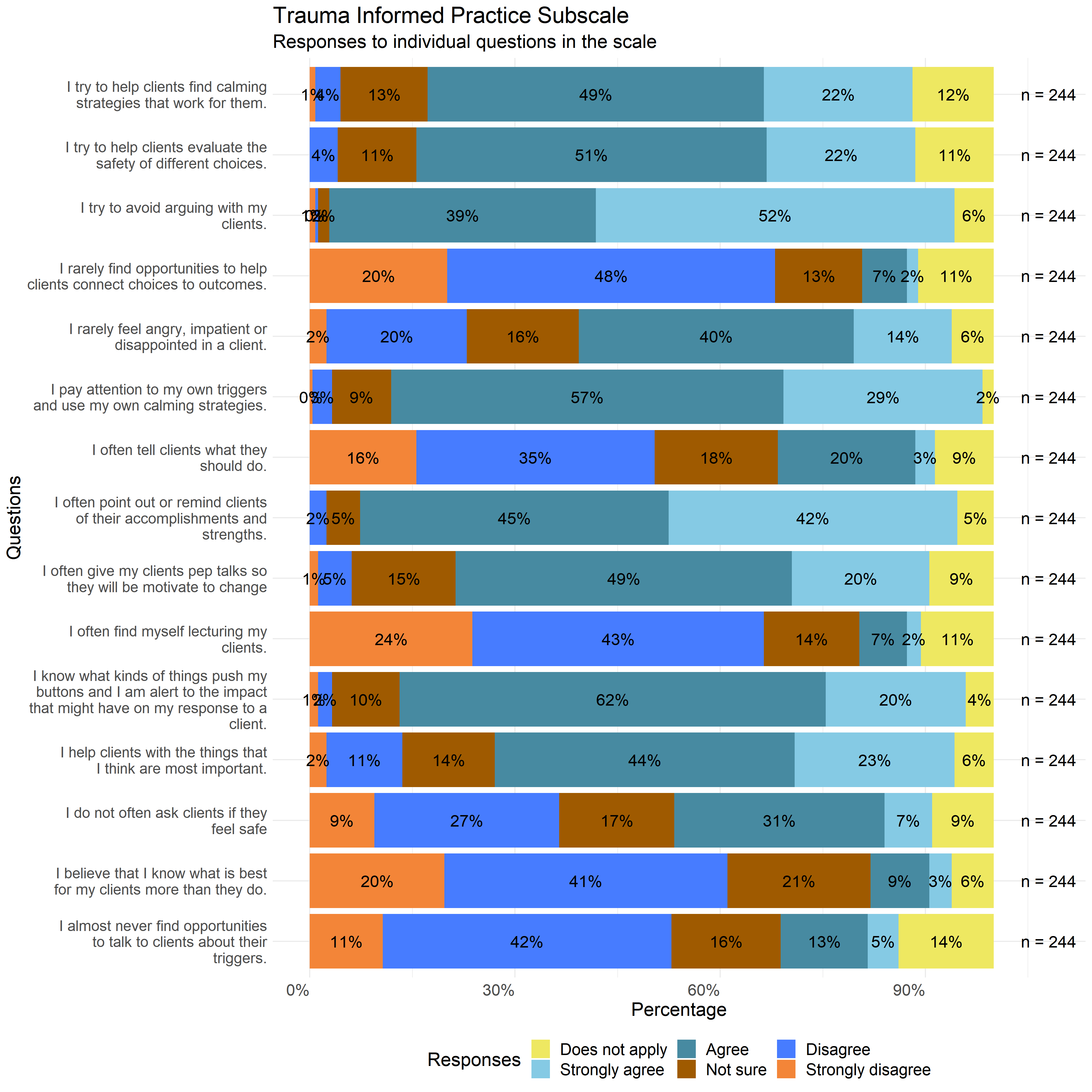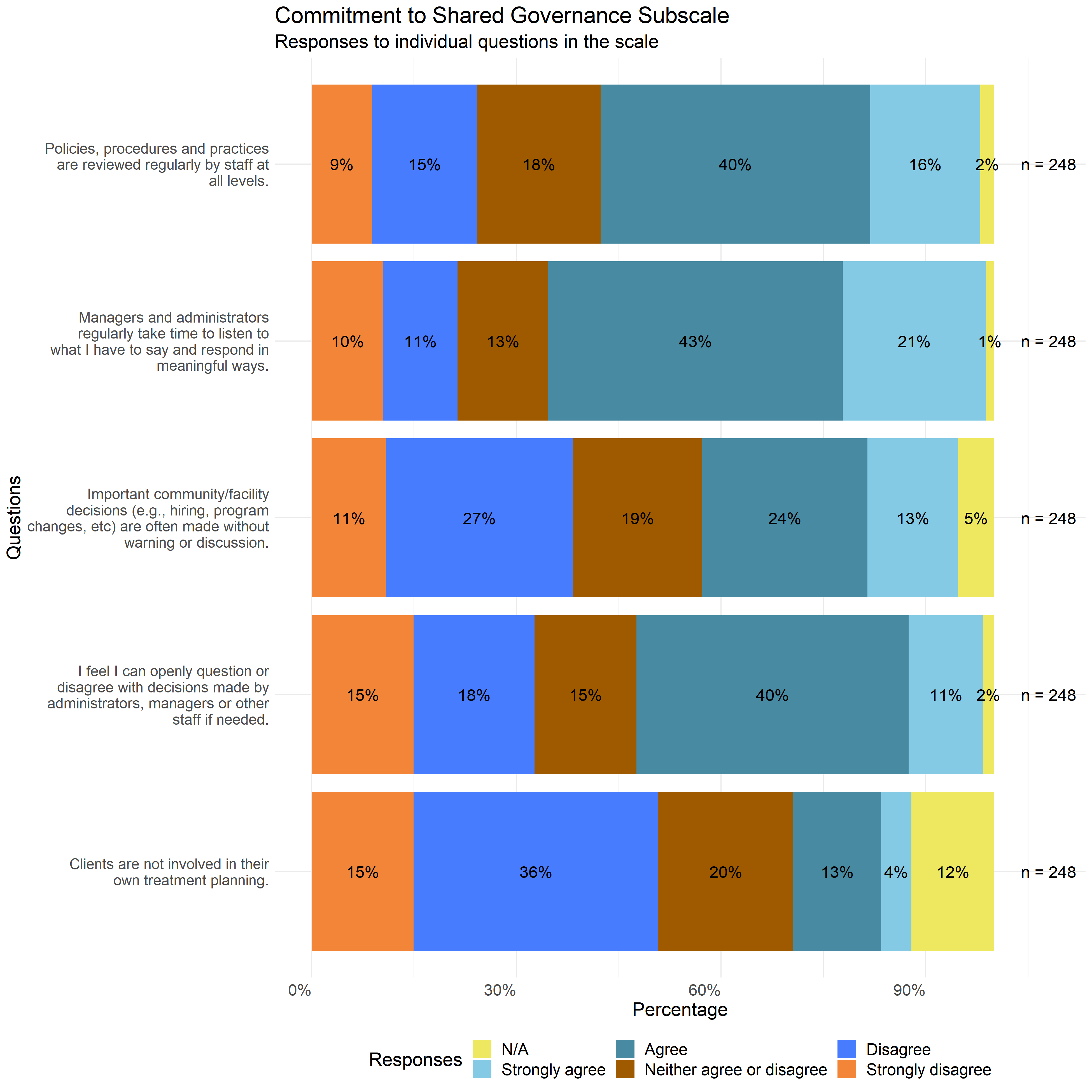 The following graphs show the distribution of responses to the specific survey questions that make up each scale used in this report.