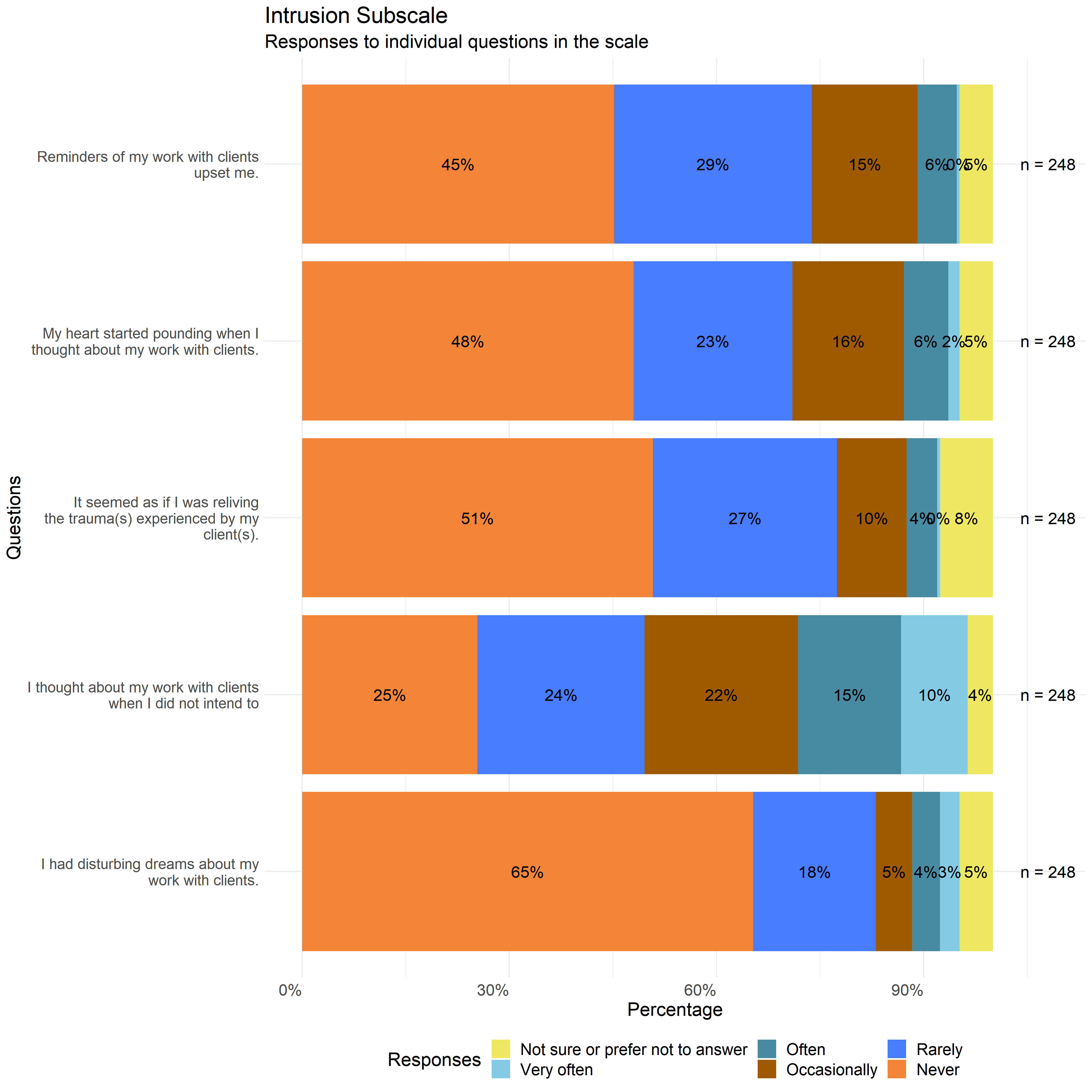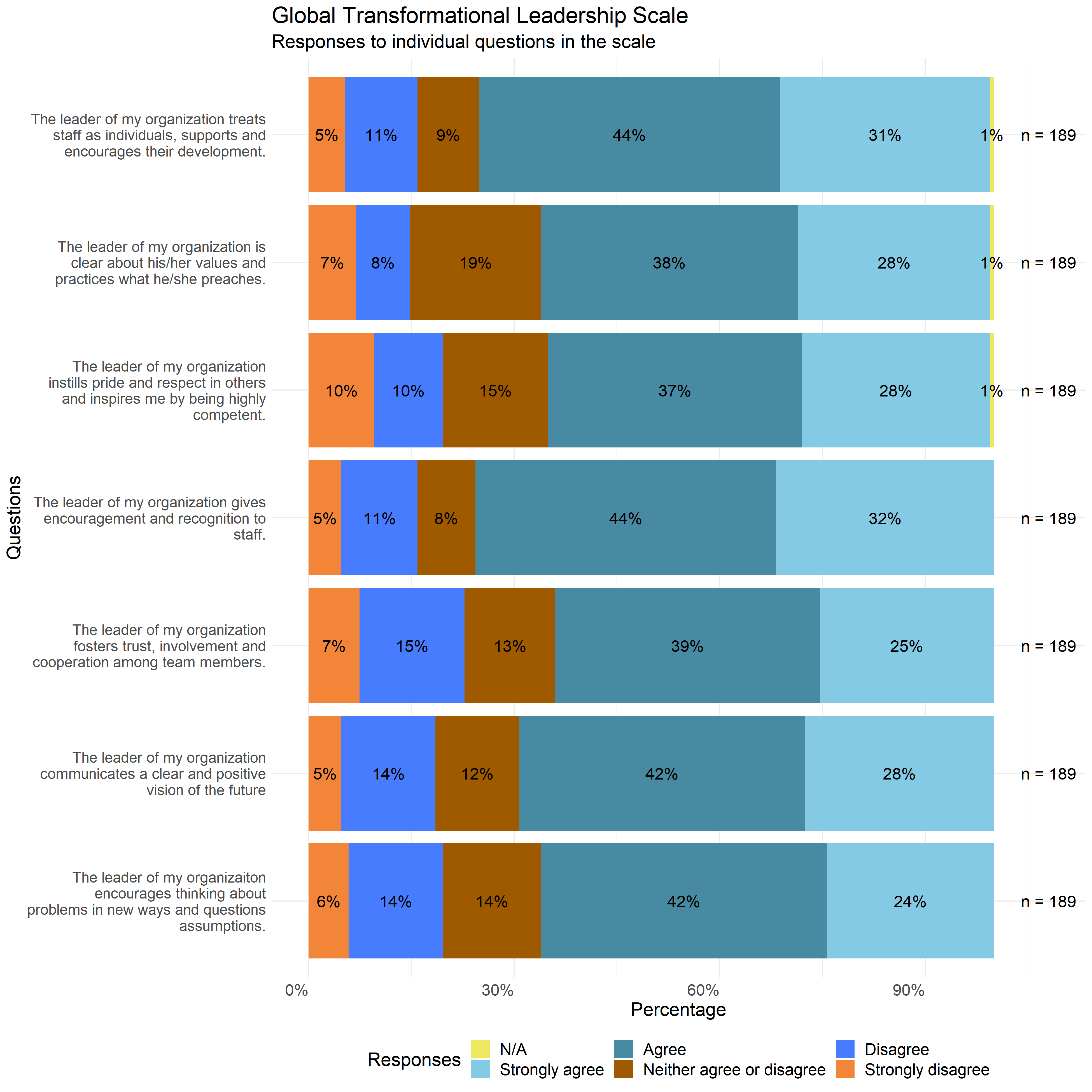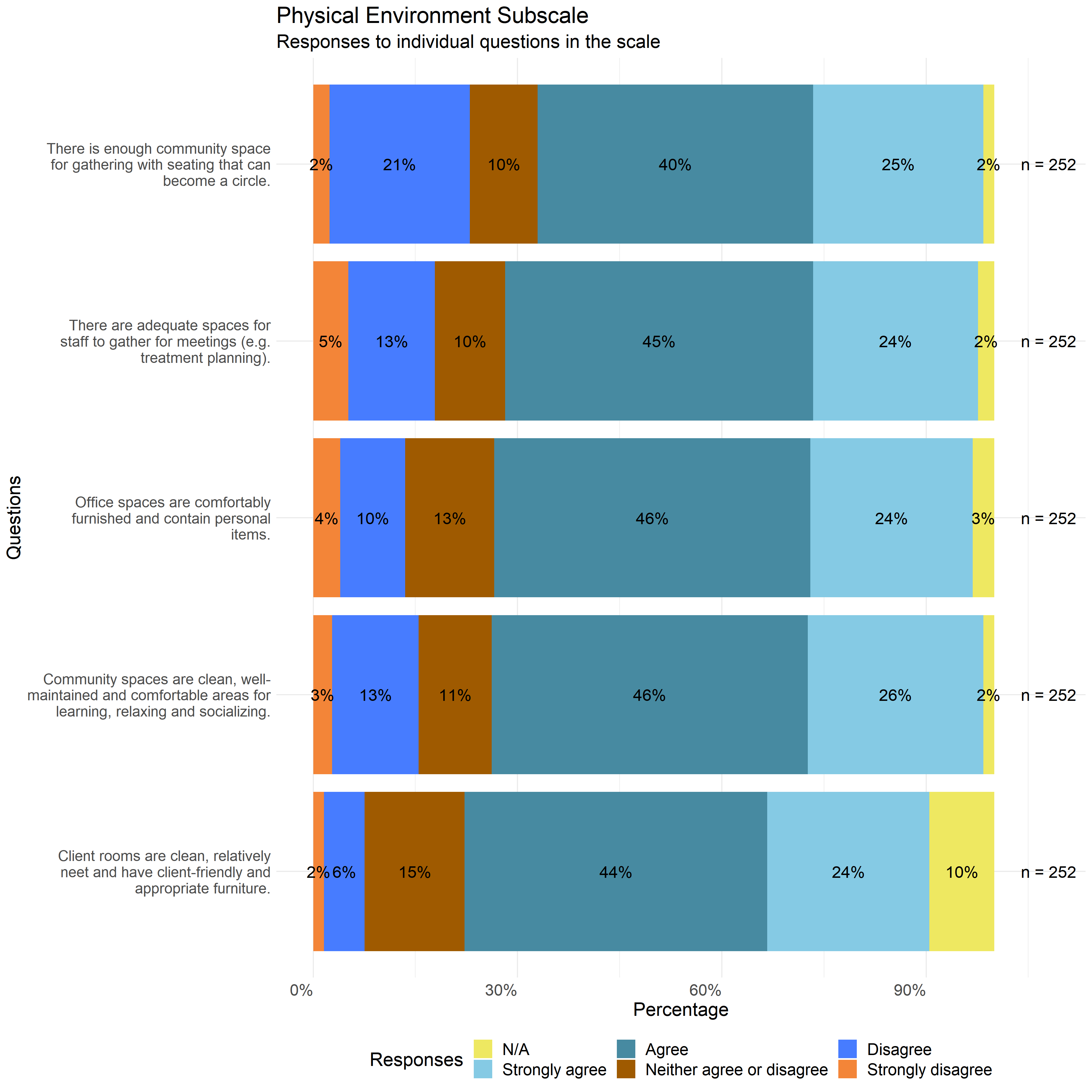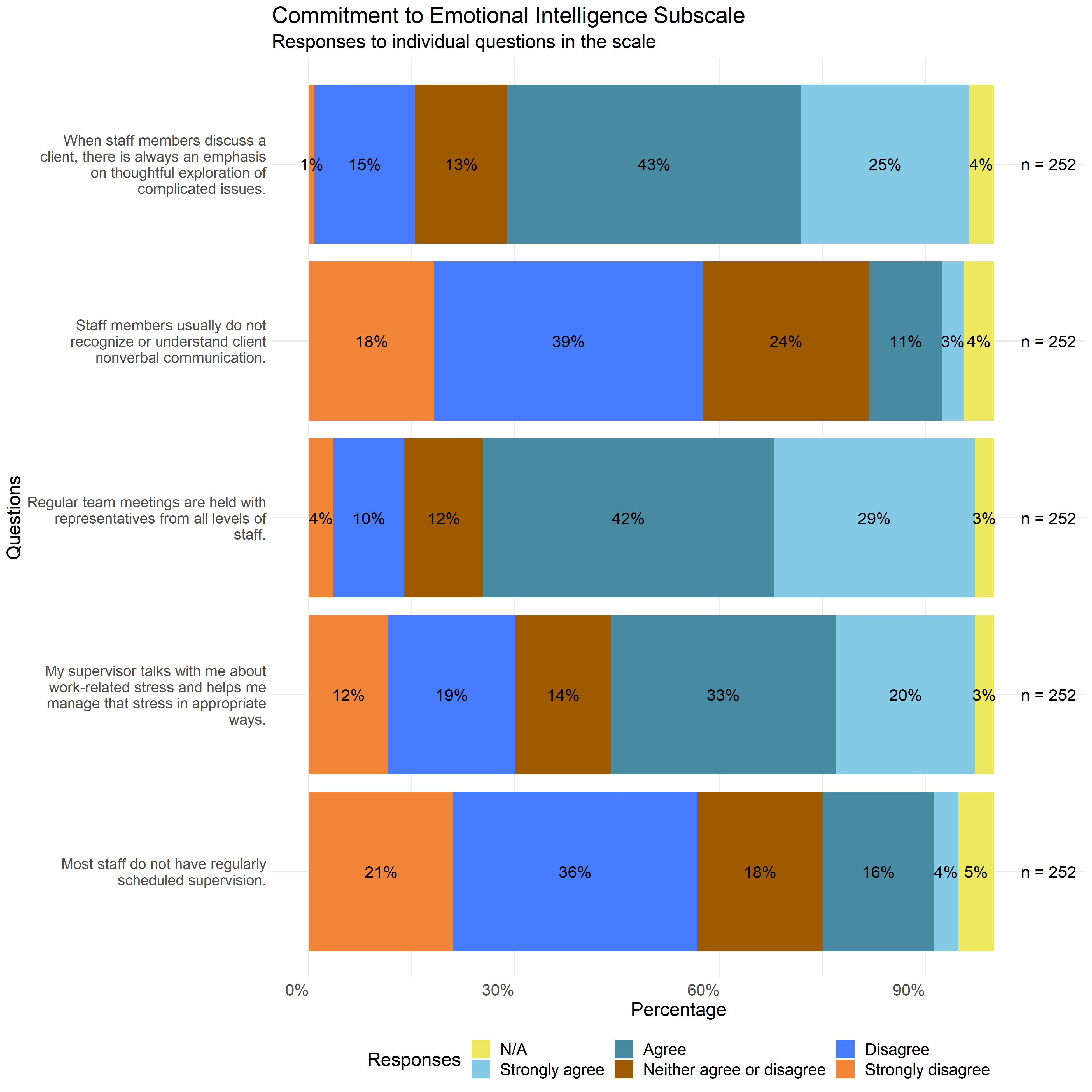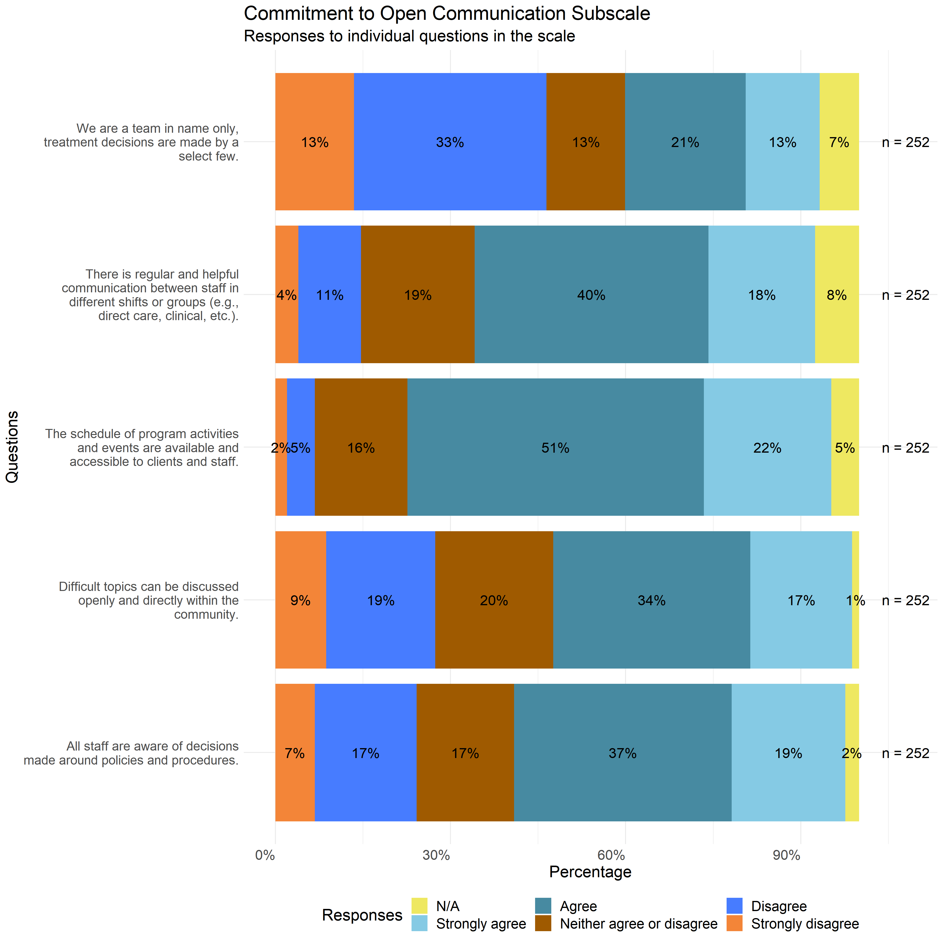 The following graphs show the distribution of responses to the specific survey questions that make up each scale used in this report.