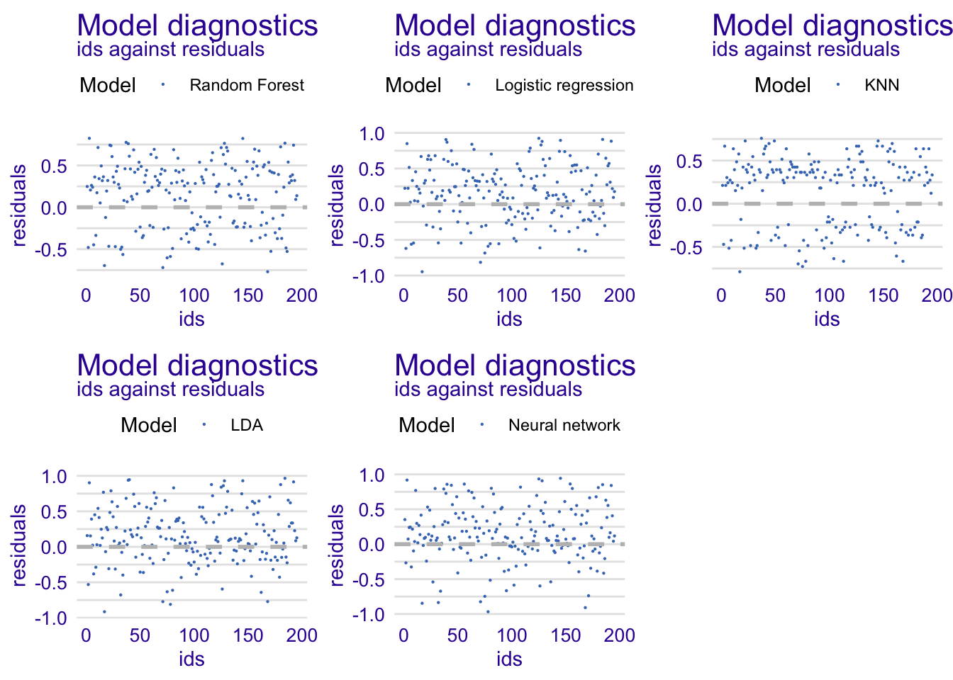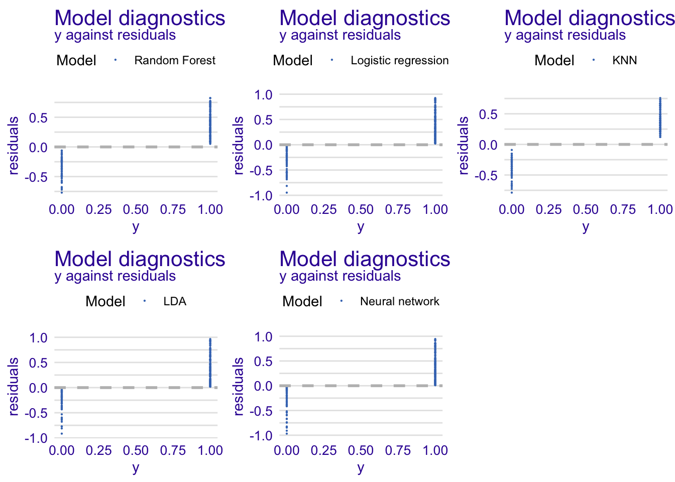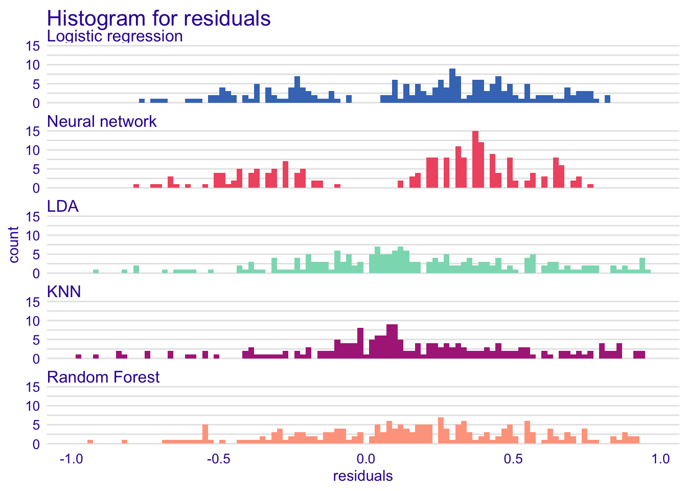 Because we already computed the accuracy and the ROC of each model in the previous part, we will not reproduce the results here. We will rather display the distributions of the residuals. Usually, in a good model, residuals deviate randomly from zero. Therefore, we should observe a symmetric distribution around zero (mean = 0). In addition, we want to limit the variability of residuals in our models, therefore we aim to have residuals close to zero.