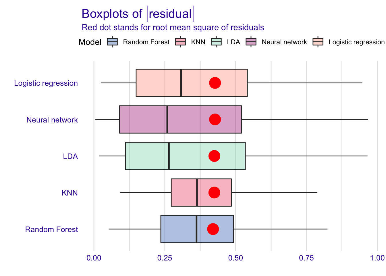 The box-and-whisker plots of the residuals confirm the results and show that LDA residuals are more frequently close to zero with neural network, but also more spreaded.