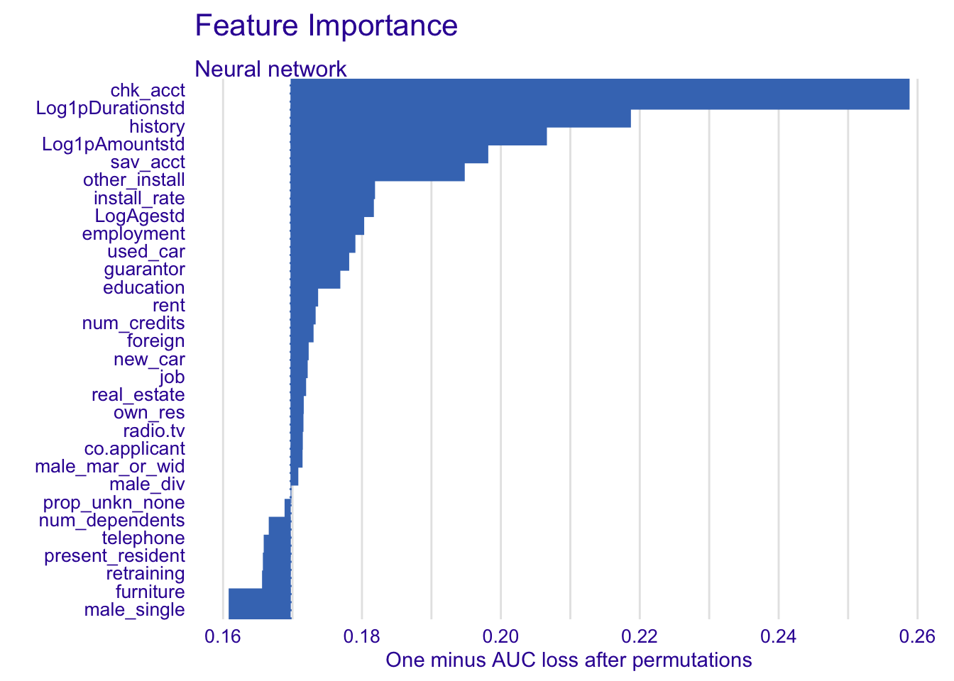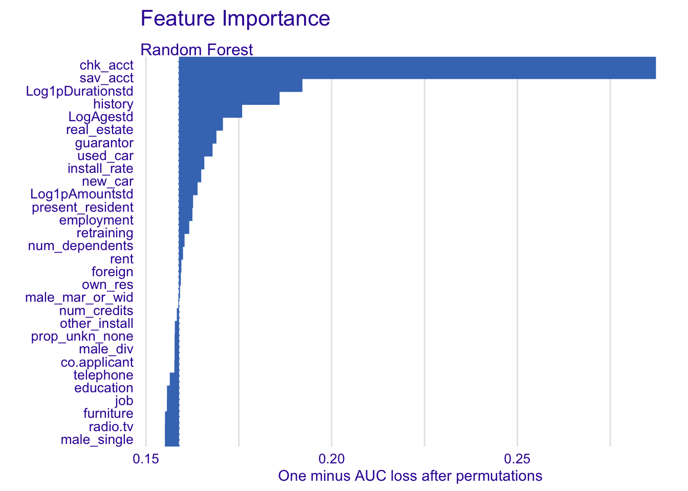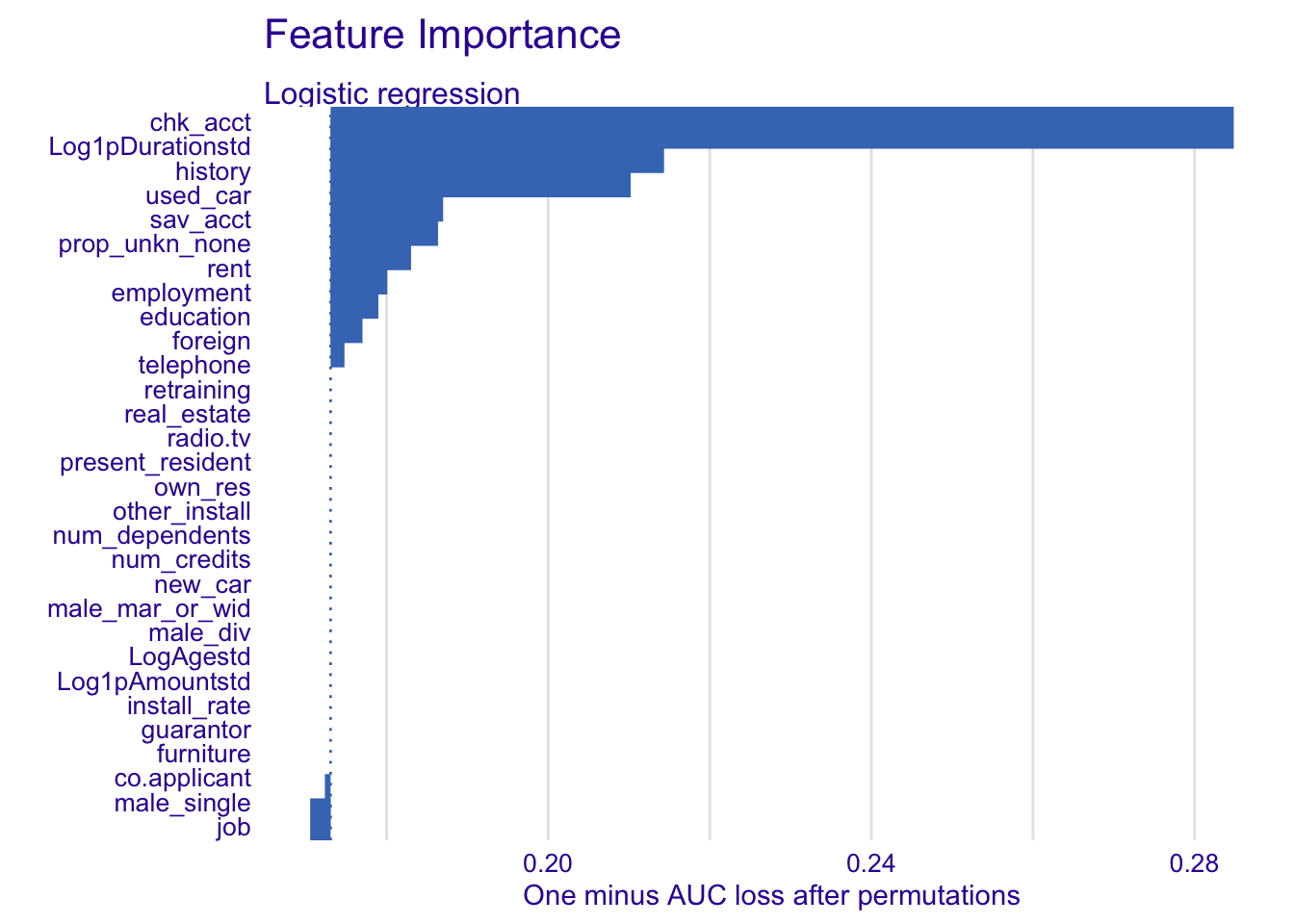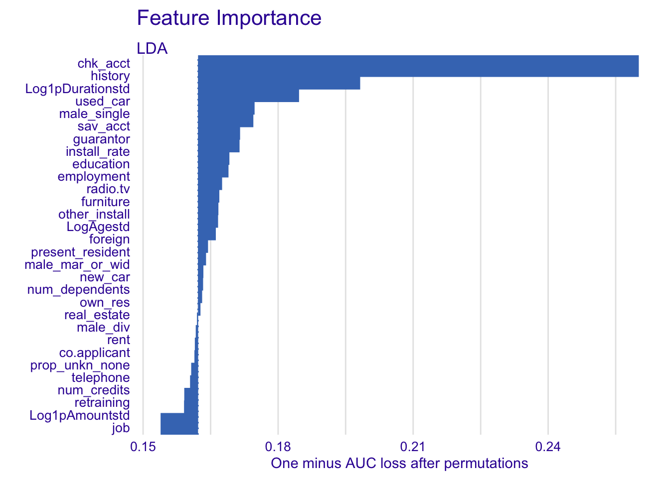 The effect is really obvious for chk_acct, used_car and Log1pDurationstd.