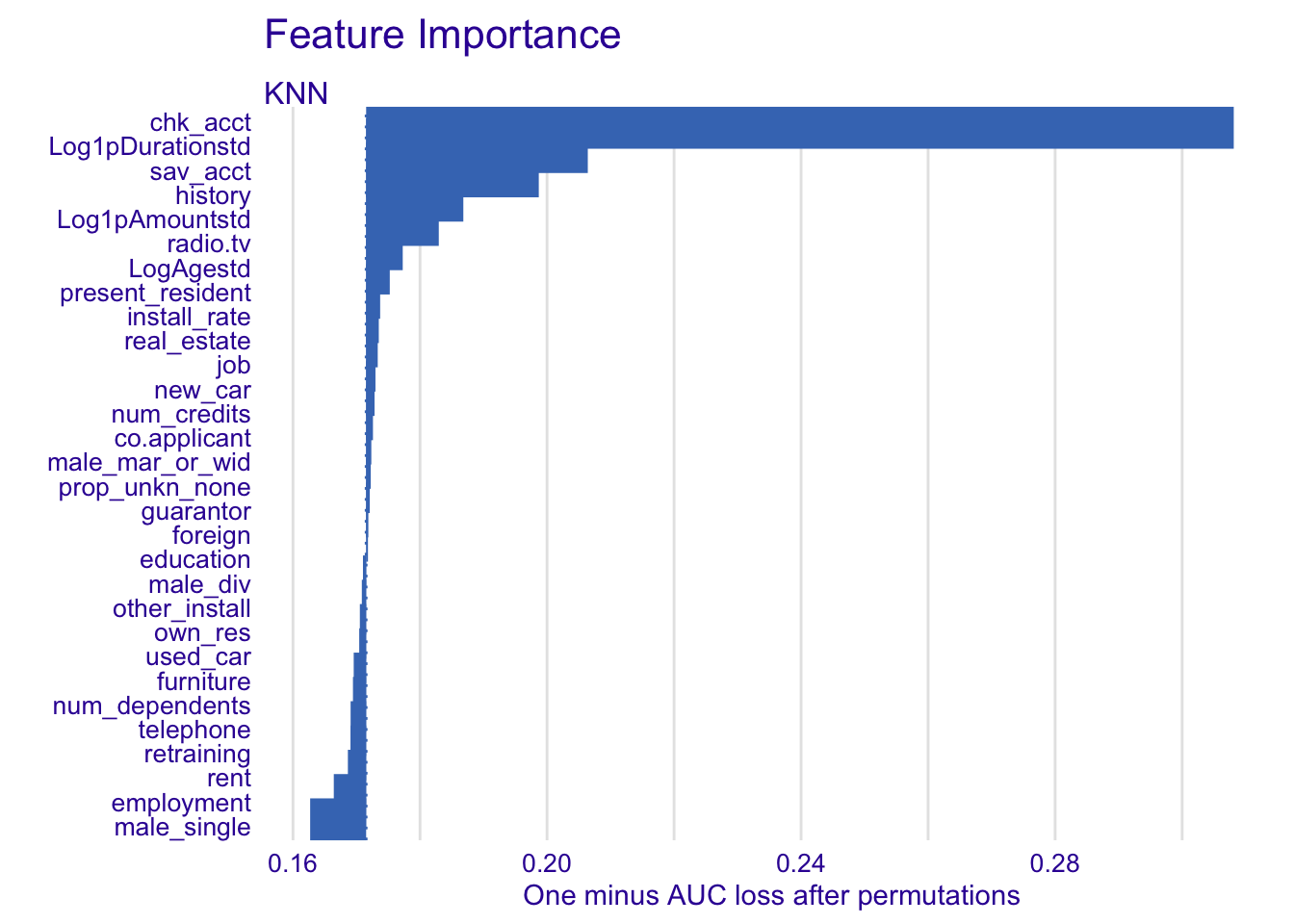 For the KNN model, we have more positive changes in the mean prediction, but chk_acct has still the most important variation, which is a negative one again.