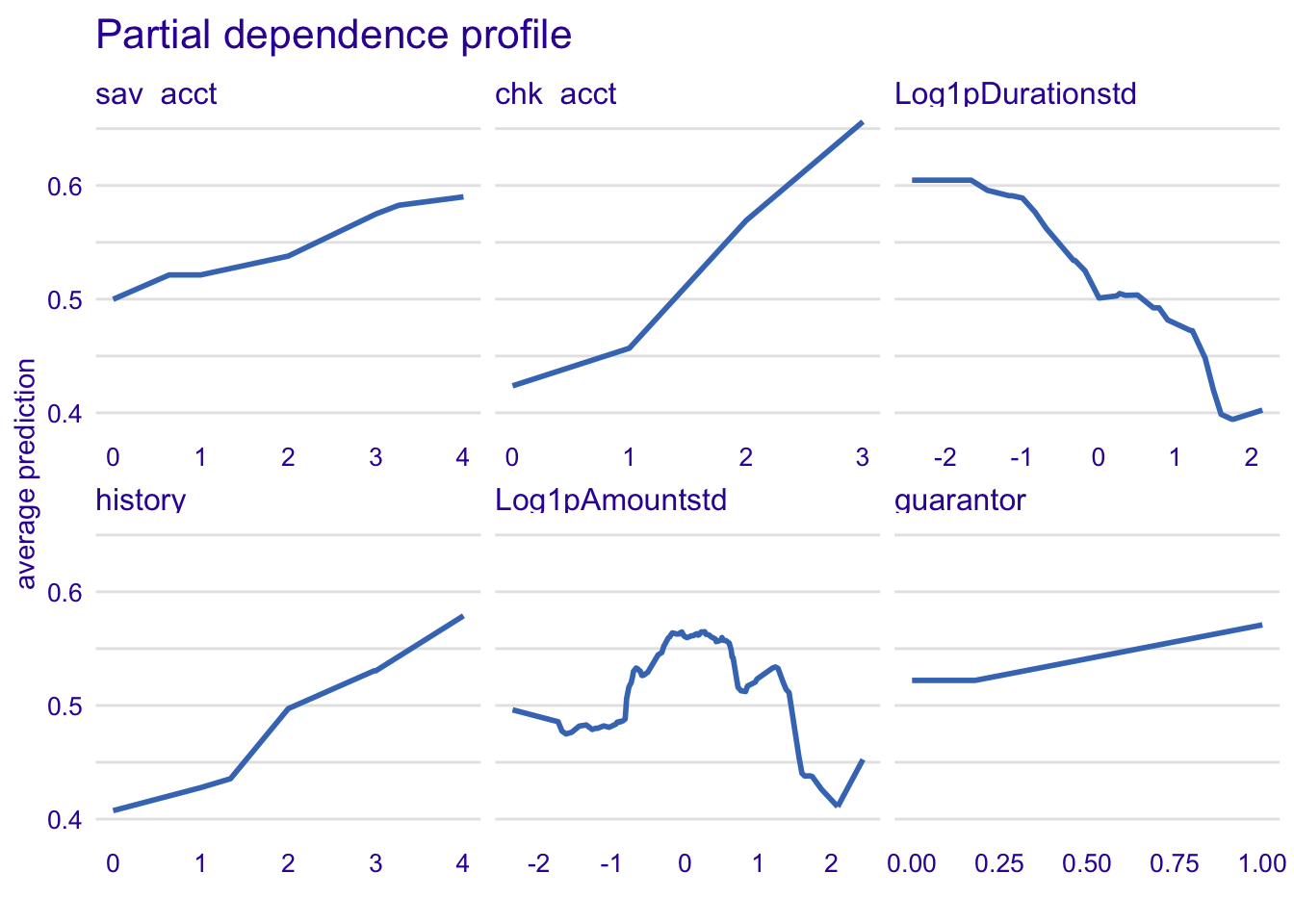 plot(model_profile_rf1, variables = c("sav_acct", "chk_acct", "Log1pDurationstd", "history", "Log1pAmountstd", "guarantor")) + ggtitle("Partial dependence profile ", "")