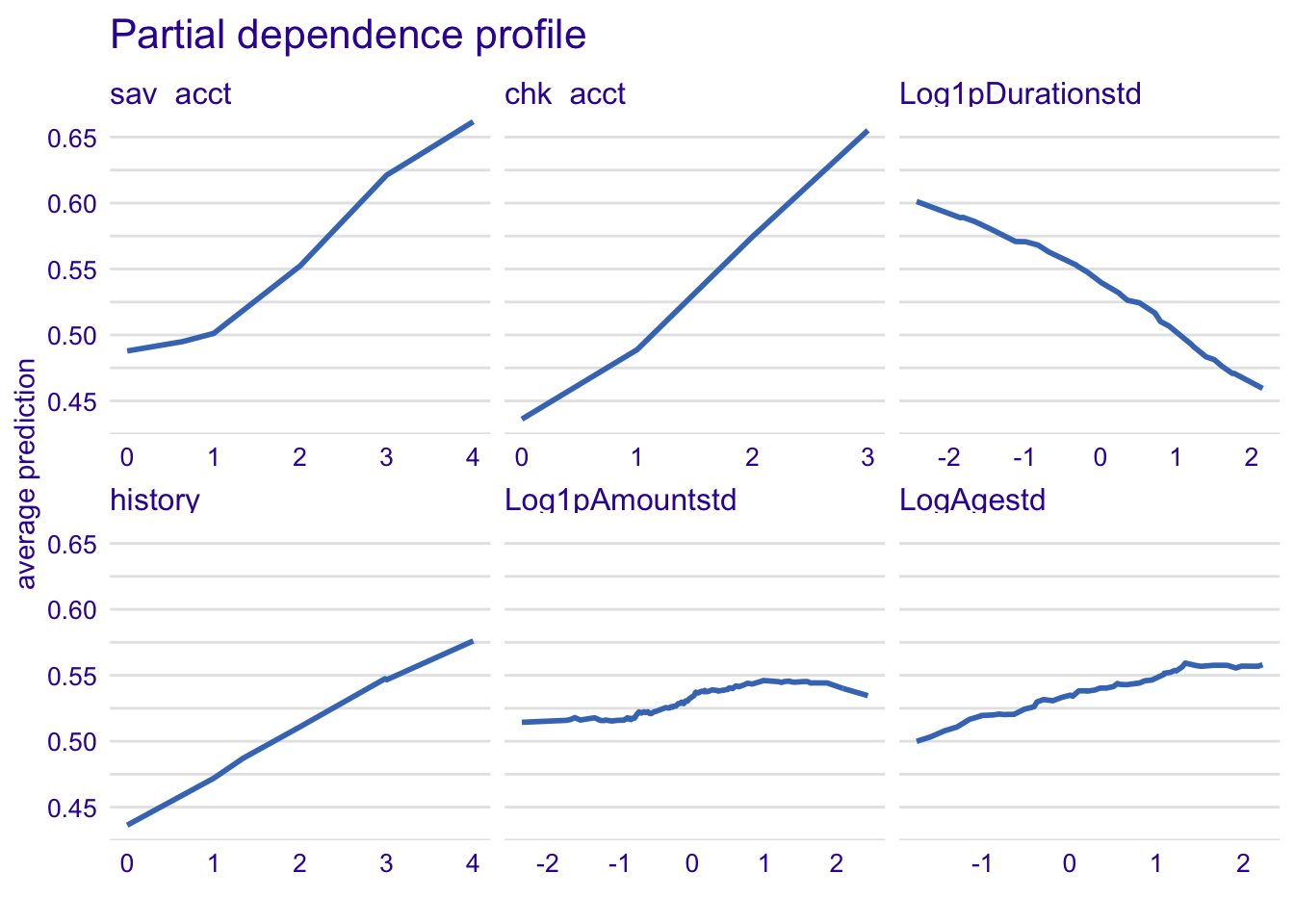 plot(model_profile_knn1, variables = c("sav_acct", "chk_acct", "Log1pDurationstd", "history", "Log1pAmountstd", "LogAgestd")) + ggtitle("Partial dependence profile ", "")