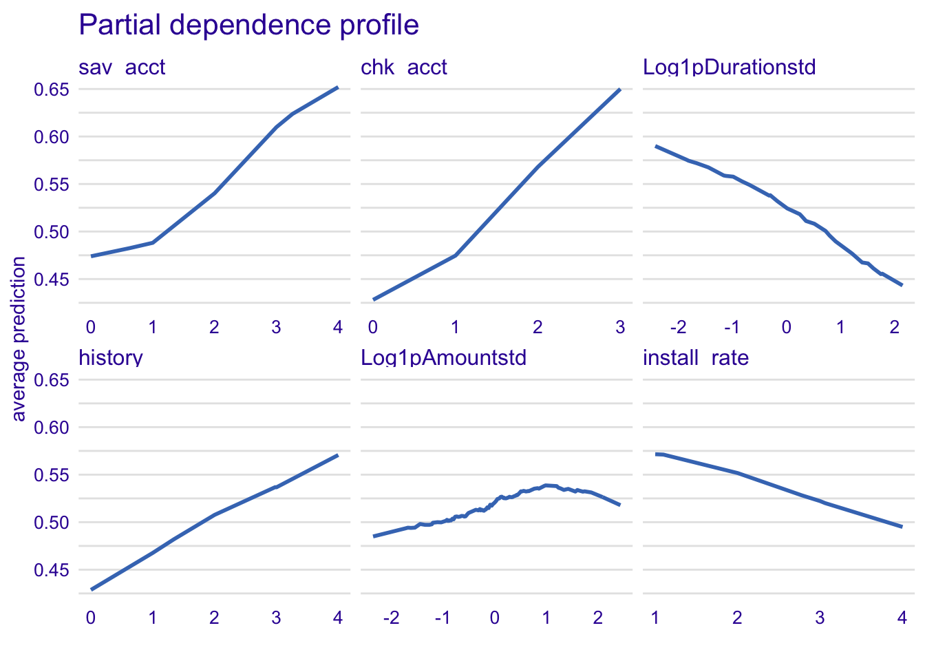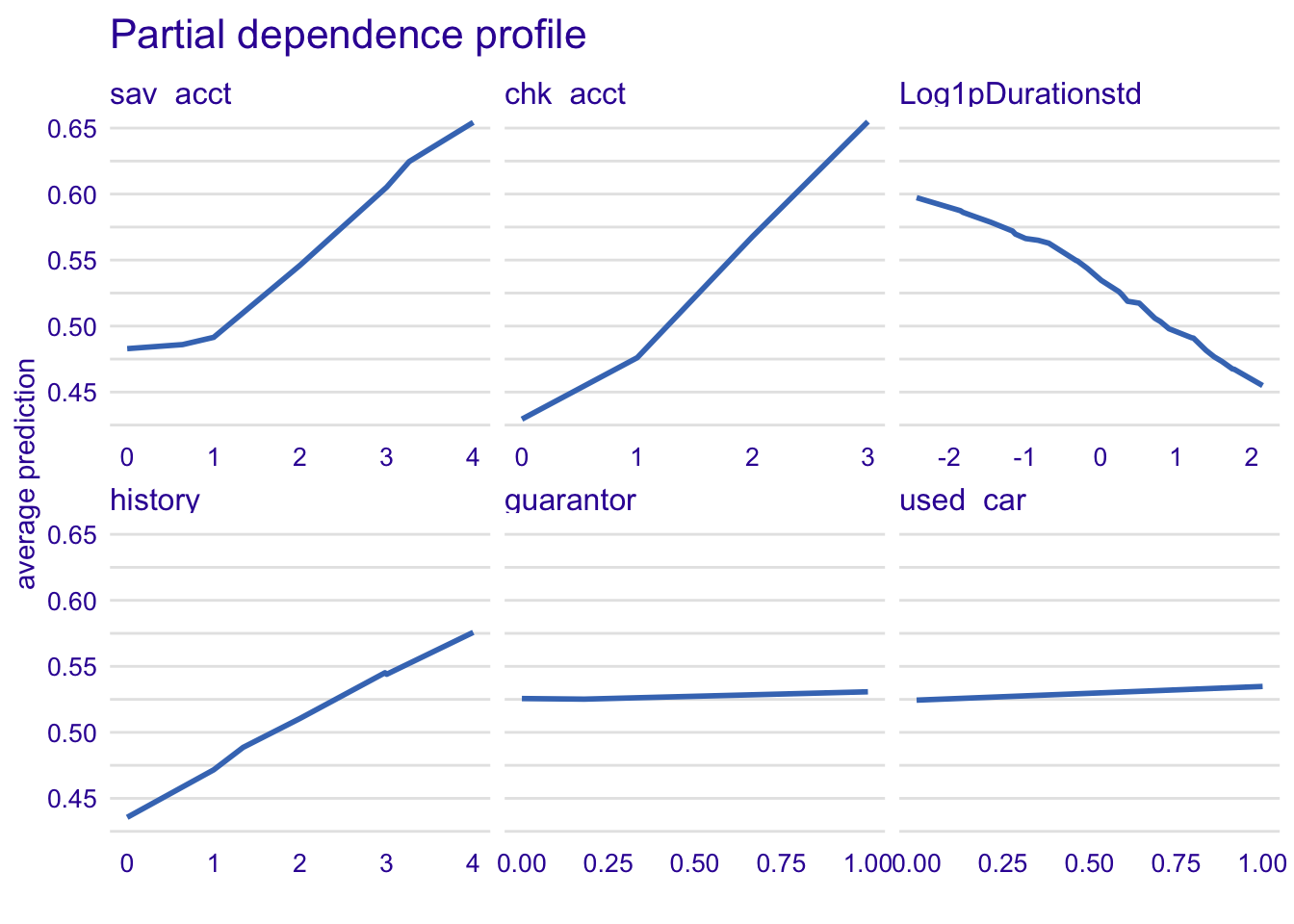 plot(model_profile_glm1, variables = c("chk_acct", "Log1pDurationstd", "sav_acct", "history", "education", "used_car")) + ggtitle("Partial dependence profile ", "")