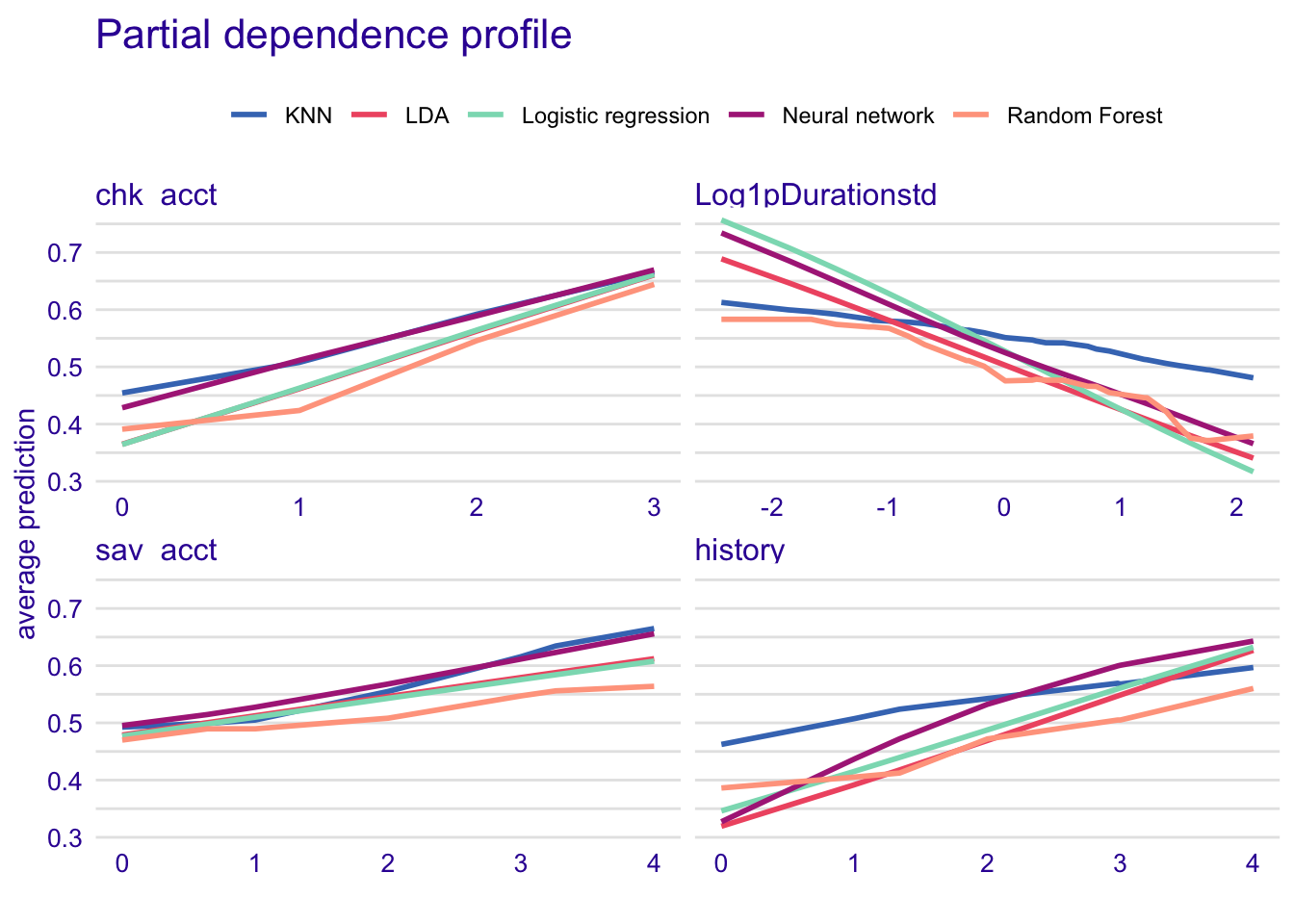 plot(model_profile_rf_com, model_profile_glm_com, model_profile_knn_com, model_profile_lda_com, model_profile_nn_com, variables = c("chk_acct", "Log1pDurationstd", "sav_acct", "history")) + ggtitle("Partial dependence profile", "")