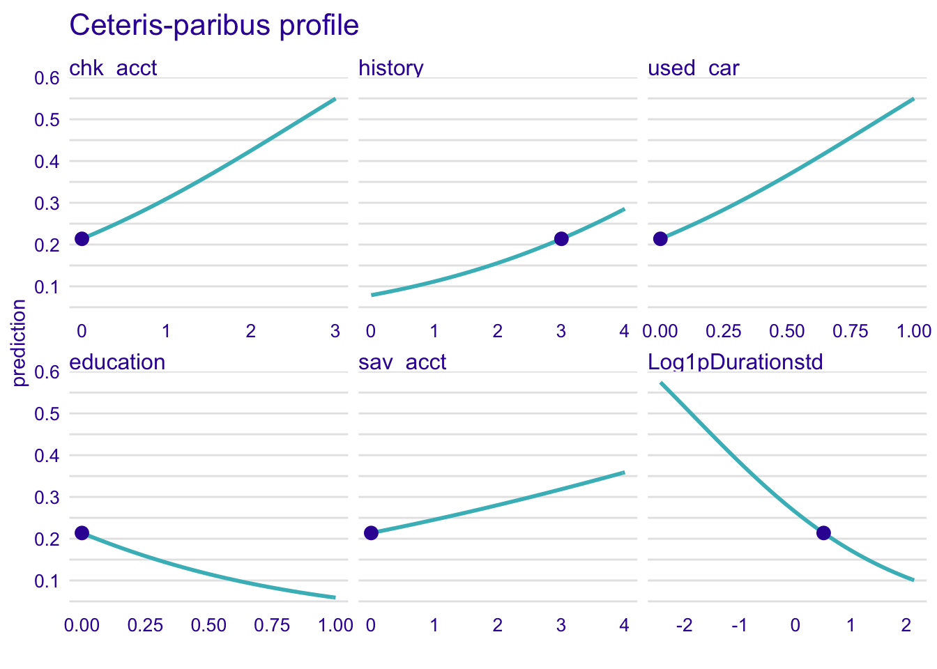 model_profile_glm1 <- model_profile(explainer_glm, type = "partial", variables = c("chk_acct", "Log1pDurationstd", "sav_acct", "history", "education", "used_car"))