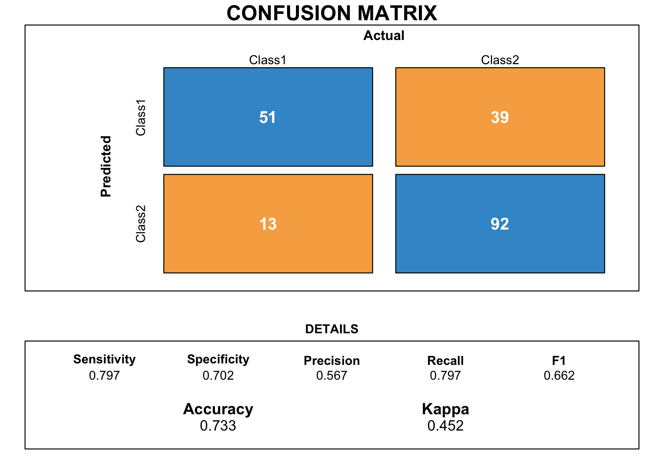 )Our confusion matrix plot shows that sensitivity and specificity are quite well balanced. However, accuracy is quite low.