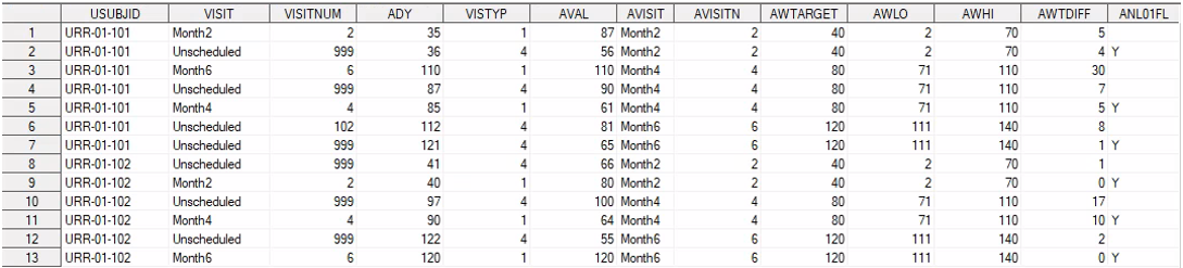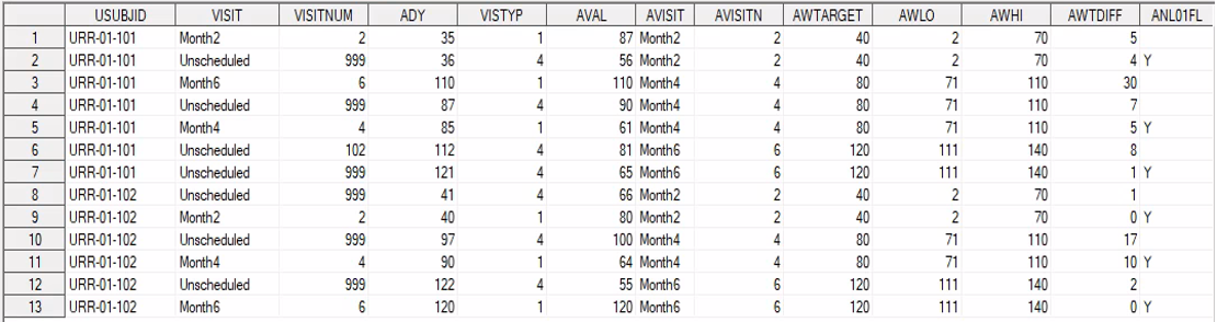 - If two or more assessments are taken on the same date or same date and time , that is, if there is a scheduled visit,re-test visit(for lab data) and an unscheduled visit on the same date and time, then we choose scheduled visit first, then re-test visit and then unscheduled visit. That is one with smallest raw visit number. 2.For this we may create a variable called VISTYP and give for example values 1 to 3 to scheduled visit, re-test visit and unscheduled visit. Different rules can be applied for the selection of analysis visit with visit windowing. In most cases, the above codes can be applied. For the raw visits that do not fall under the visit window range we may either set it to blank or give “Not Windowed”.