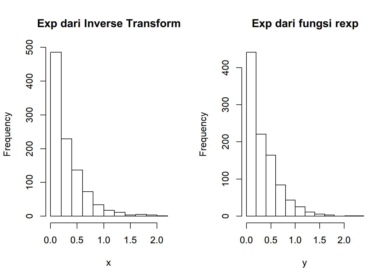 inverse CDF dari \(exponential(3)\) \(F^{-1}(u) = -\frac{ln(1-u)}{3}, x \geq 0\)