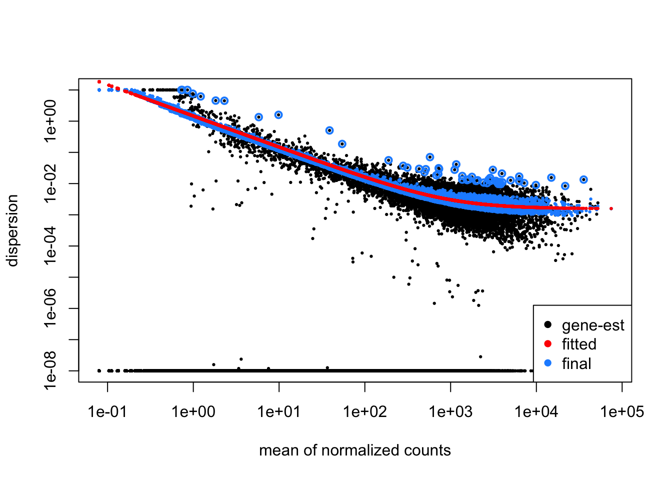 Dispersion estimates that are slightly above the curve are also shrunk toward the curve for better dispersion estimation; however, genes with extremely high dispersion values are not. This is due to the likelihood that the gene does not follow the modeling assumptions and has higher variability than others for biological or technical reasons. Shrinking the values toward the curve could result in false positives, so these values are not shrunken. These genes are shown surrounded by blue circles below.
