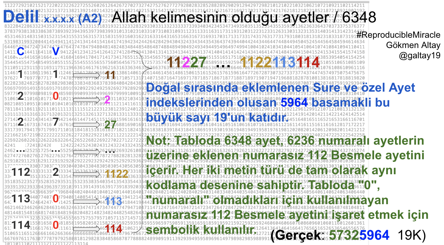 Evrensel kurala göre, bu kitapta Kuran’ın her iki metin türünü de kullandığım için, yine her ikisi için ilgili sayıları elde edeceğim. Hatırlatmak gerekirse, ana metin türü numarasız Besmele ayetlerini de içeren tüm 6348 ayet içindir ve ikinci metin türü ise sadece 6236 numaralandırılmış ayetler içindir.