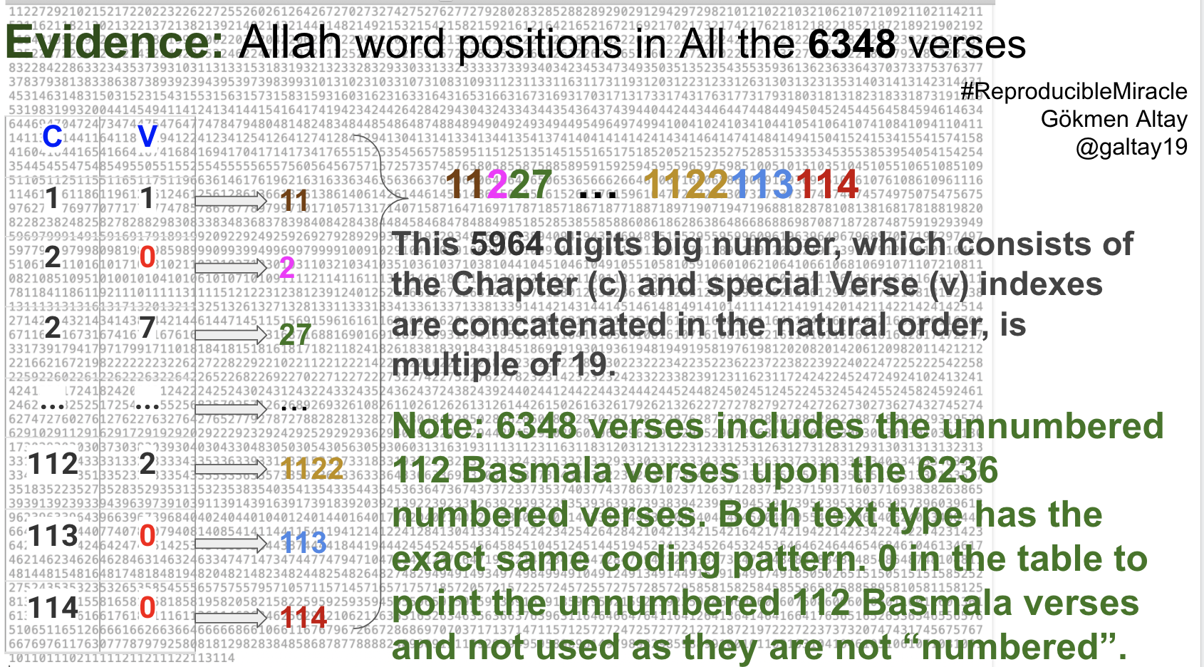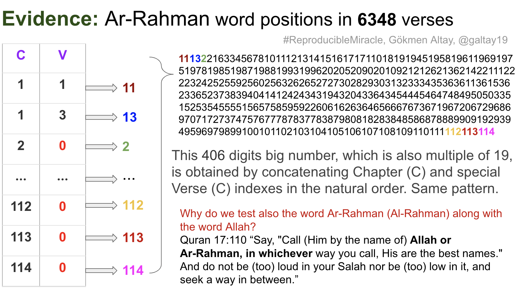 Therefore, in the sub-chapters of this chapter, in Evidence 5.1, I will provide the evidences that show the positions and counts of Allah and Al-Rahman words over all the verses of Quran are under 19 based design individually and also together with the same coding pattern.