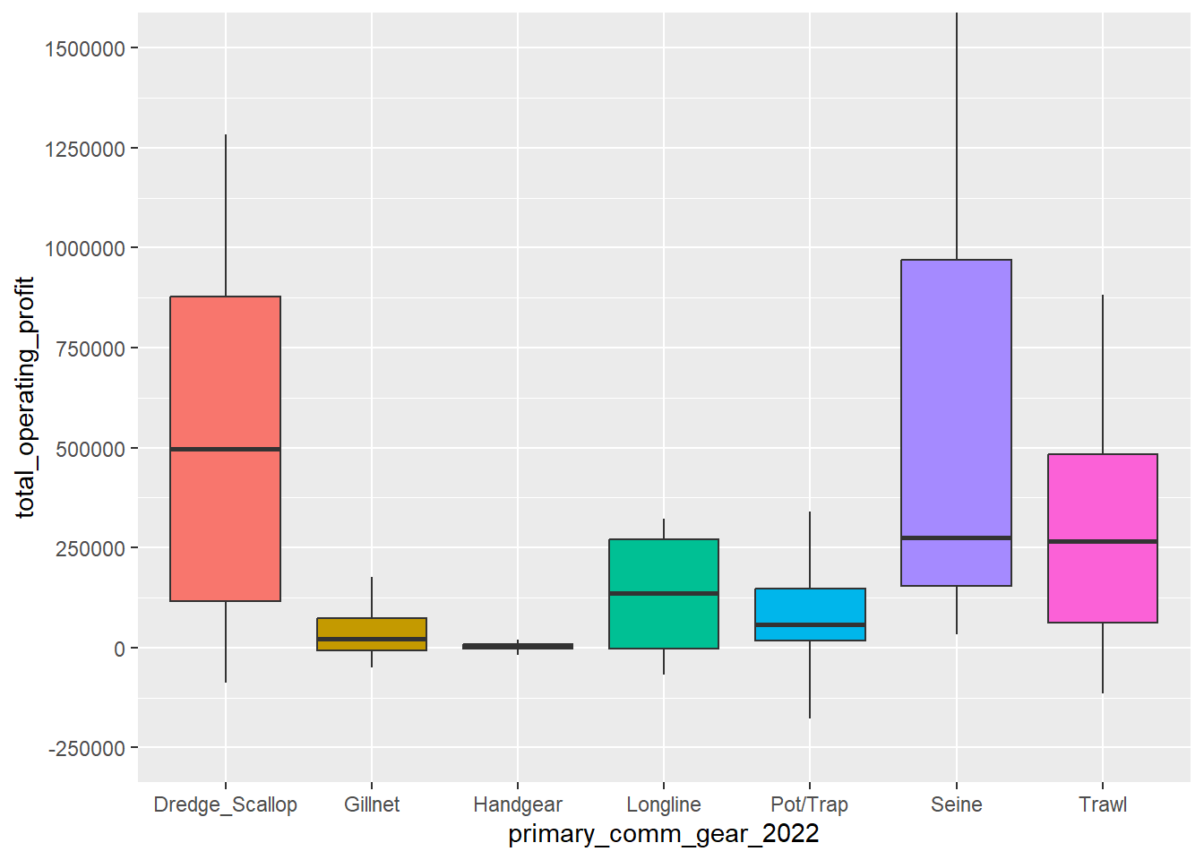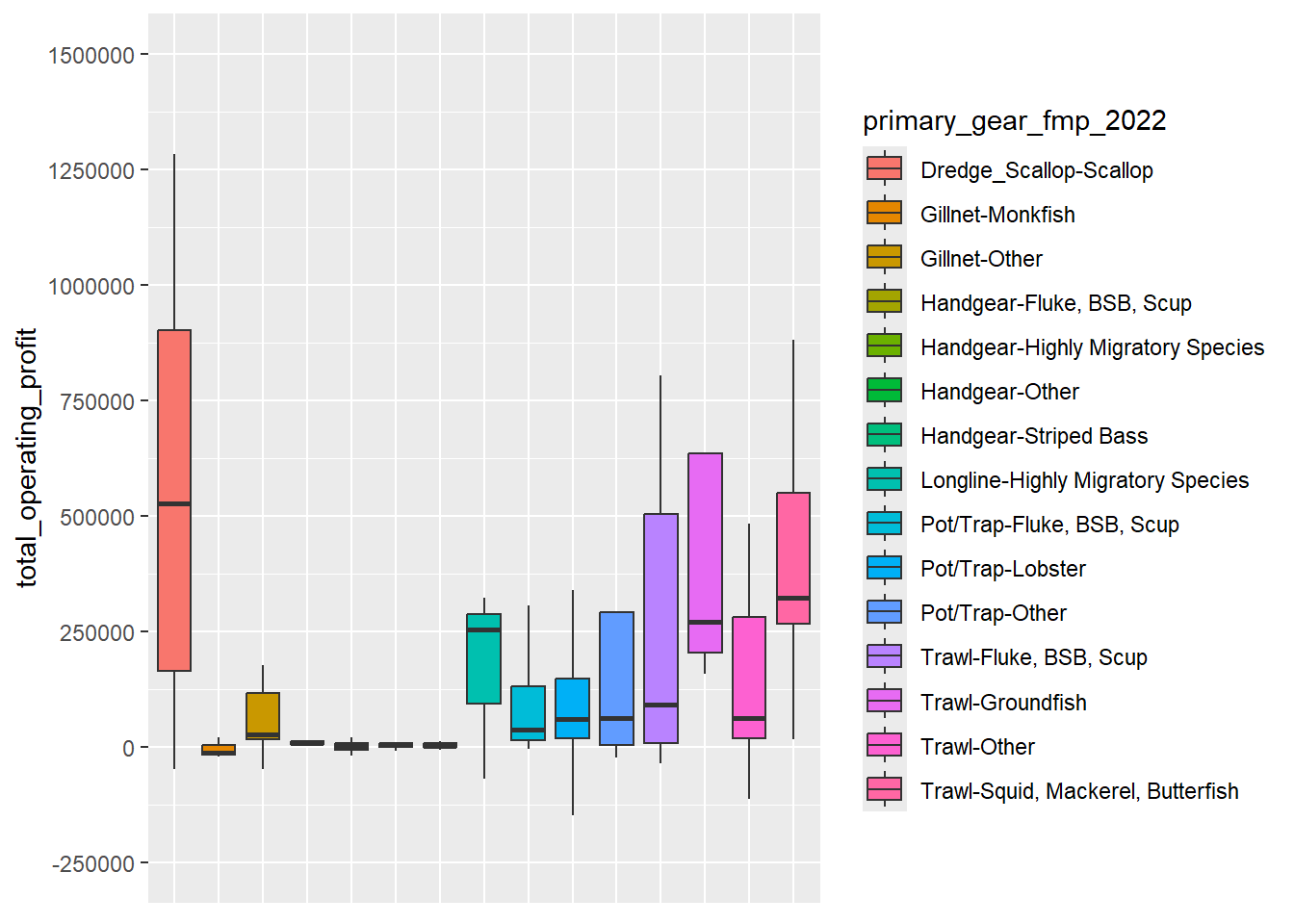 By primary gear, scallop dredge has considerably higher mean and median operating profit than other gear groups. Trawl has the second highest mean and median values, followed by pot/trap, gillnet, and handgear. For gillnet and trawl gear, mean values greatly exceed median values, indicating skewness in the distribution to the right. For pot/trap and scallop dredge, the difference between mean and median values is not as large. The boxplots emphasize the range of operating profit by gear group with the box extending past $750K for scallop dredge and ~$500k for trawl. Pot/trap and gillnet extend considerably less and handgear is close to $0.