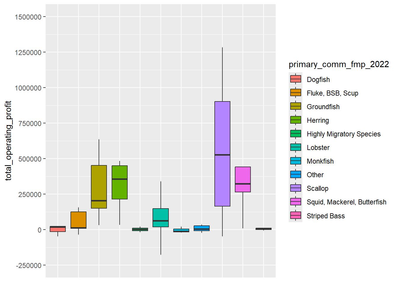 By FMP, scallop has higher mean and median operating profit than other fisheries. Squid, mackerel, butterfish has the second highest mean values, while herring has the second highest median values. Groundfish has the third highest mean values. For squid, mackerel, butterfish, groundfish, and summer flounder, black sea bass, scup, mean values greatly exceed median values, indicating skewness in the distribution to the right. For lobster and scallop, the difference between mean and median values is not as large. The boxplots emphasize the range of operating profit by gear group with the box extending past $750K for scallop dredge and close to $500k for groundfish, herring, and squid, mackerel, butterfish. Lobster extends to ~100k and other fisheries are close to $0.
