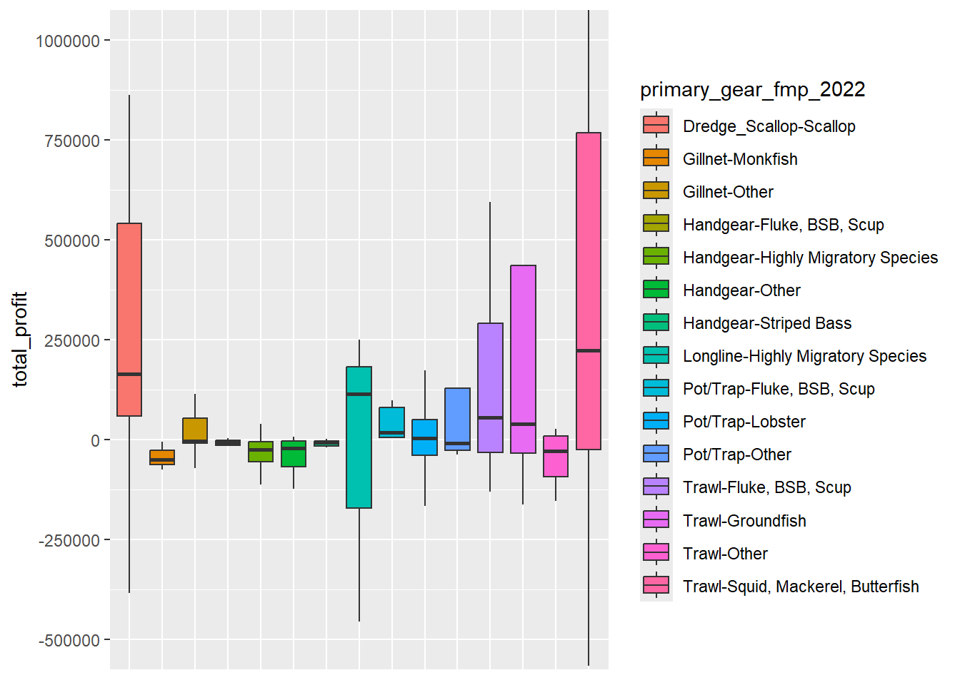By primary gear, scallop dredge has considerably higher mean and median total profit than other gear groups. Trawl has the second highest mean and median values. Gillnet, handgear, and pot/trap show negative mean profit while the median value is slightly positive for pot/trap.. For scallop dredge and trawl gear, mean values greatly exceed median values. For pot/trap the opposite is true.