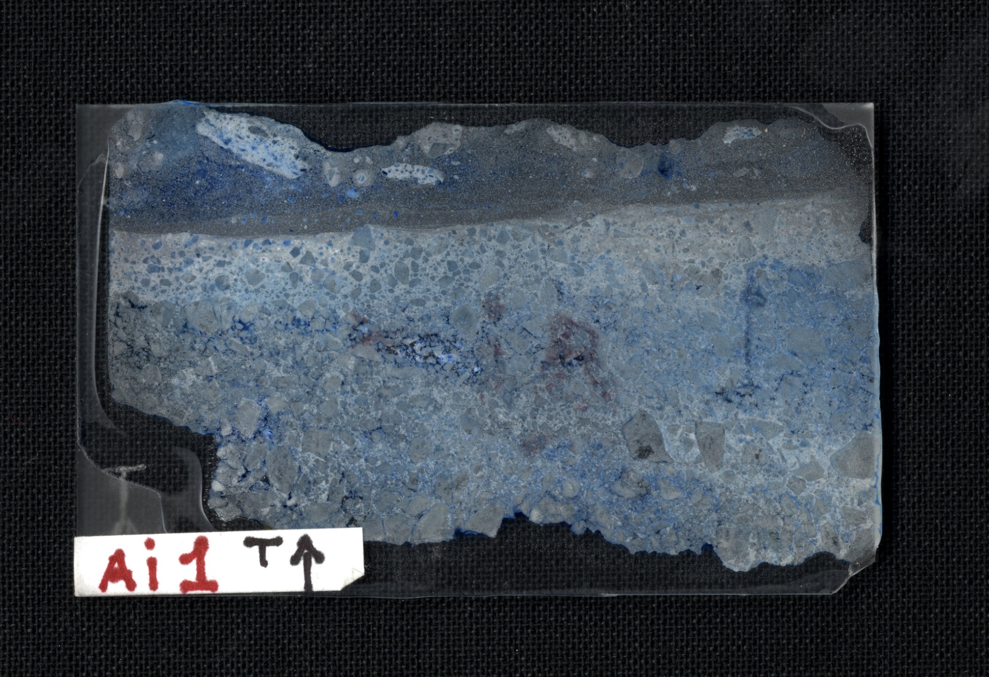The section is defined in the upper part by an evident cutting area that identifies and separates an area with a remarkably mature cataclastic texture with a very fine matrix from the underlying area with a texture that can be defined as an intermediate cataclasite in the cemented part and more proximal to the cut surface and, lower down, as an embryonic cataclasite. In addition, there are traces of sub-horizontal and NW-SE foliation.