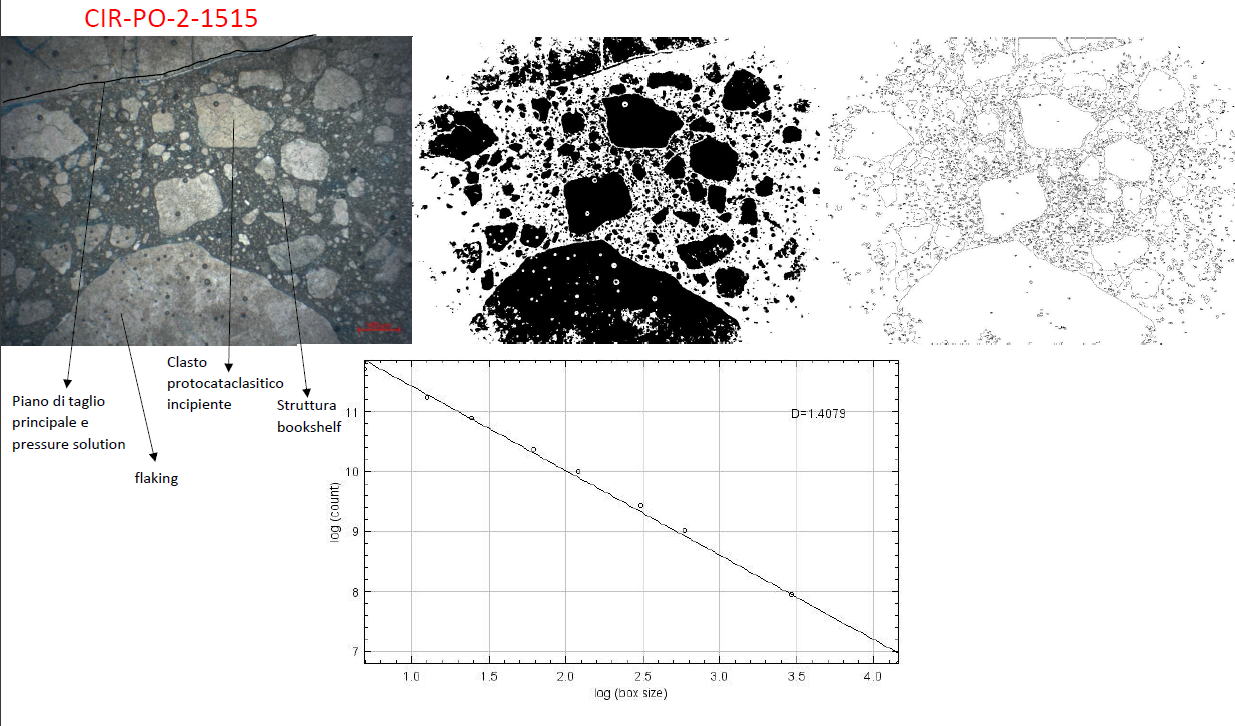 During the field activity, 6 samples were taken from the fault transept of the RBF outcropping in the Rocchetta. The aforementioned samples were processed in the Federico II University of Naples laboratory to be rendered in thin sections and analyzed under an optical microscope. 4 consequential phases characterized microstructural analysis. The first phase of the microscopic description of samples is based on the microscope images and on identifying microstructures for the definition of fabric and general texture for each sample. The second phase of image analysis through ImageJ software made it possible to carry out the fractal analysis of the distribution of clasts, determining the Dr parameter. Finally, the frequency analysis of clasts determined the third phase through MATLAB to identify the Ds parameter. The two parameters have been related in the PSD (particle size distribution Ds-Dr) graph. The following paragraph has therefore been divided into the 4 sub-paragraphs mentioned above.