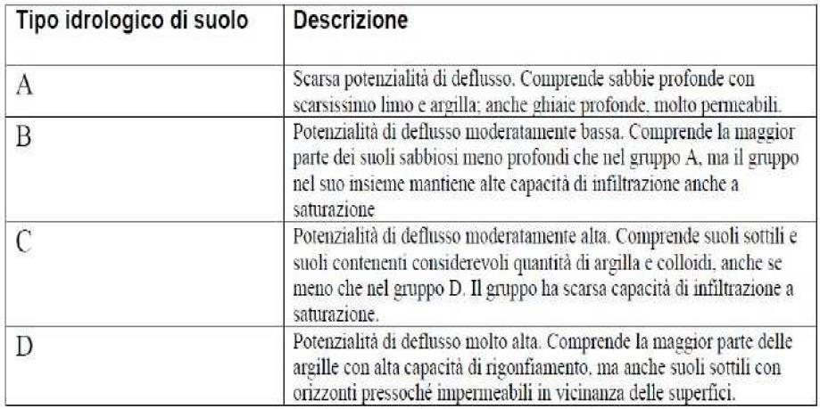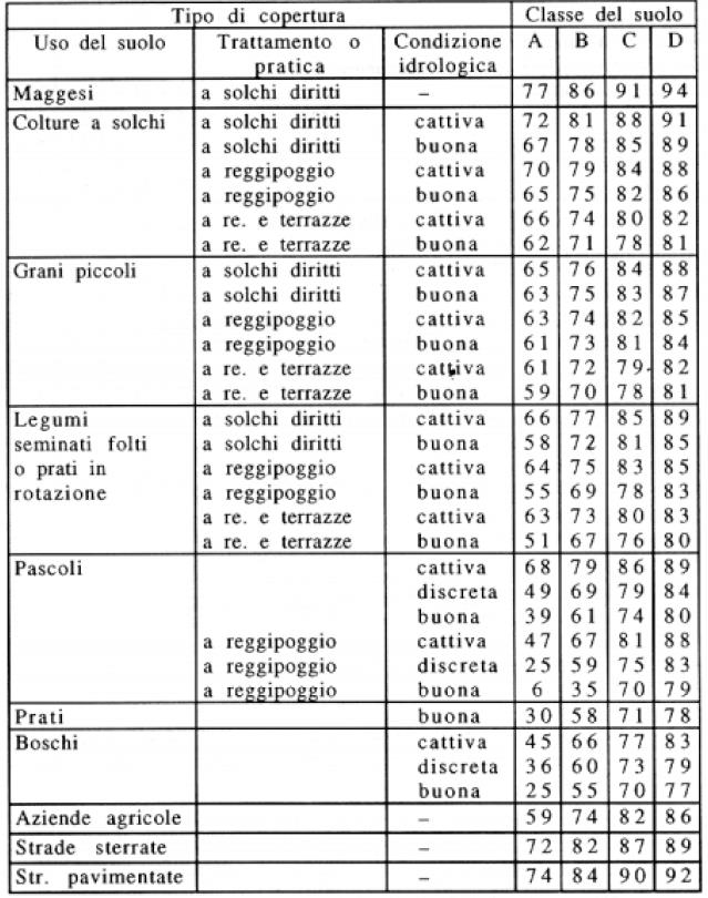 Determinata la classe del suolo in base alla capacità di assorbimento, e nota la classe di uso suolo, è possibile definire la classe di appartenenza del terreno e quindi stimare un primo valore del Curve Number, servendosi della tabella di seguito riportata (Tab. 4.14 nella versione tradotta in italiano, anche questa fornita dal NRCS americano.