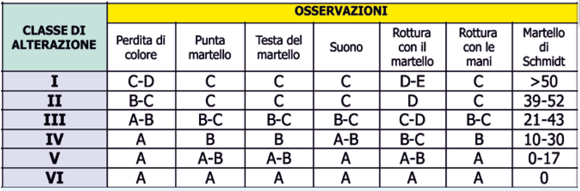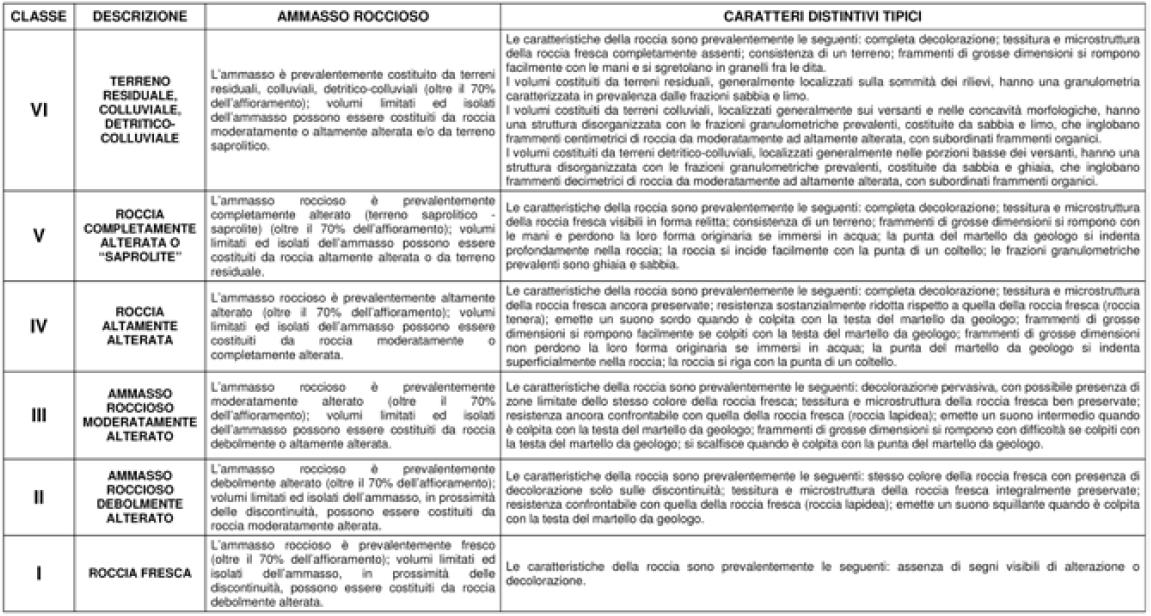 classe V (roccia completamente alterata o terreno saprolitico), classe IV (roccia altamente alterata) e classe III (roccia moderatamente alterata). Le classi di