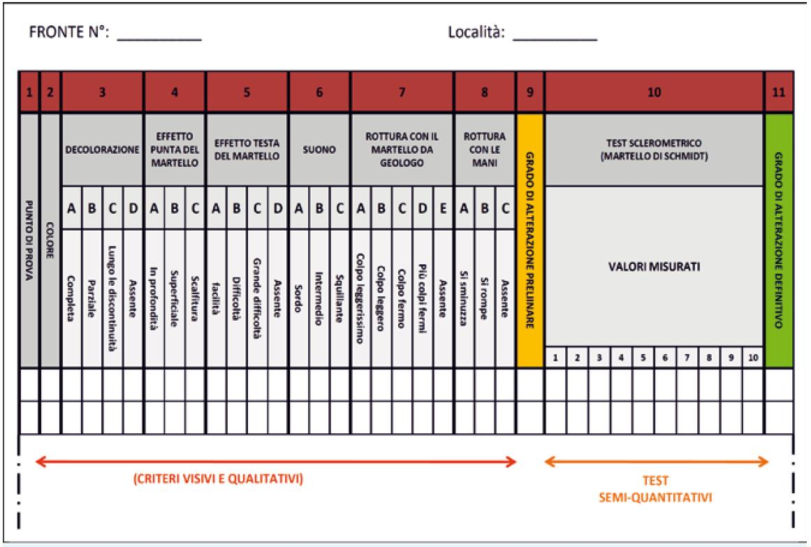 Per ogni punto di controllo (da indicare nella prima colonna, bisogna indicare il colore della roccia e riferendosi a quello della roccia fresca, il livello di decolorazione (colonne 2 e 3): (A) completa, (B) parzialmente decolorata, (C) decolorata solo lungo le discontinuità, (D) non decolorata. Per le ulteriori osservazioni, la procedura prevede l’utilizzo del martello da geologo e del martello di Schmidt; colpendo l’affioramento con il martello si valuta l’effetto della sua punta sulla superficie della roccia (colonna 4) osservando se si indenta facilmente in profondità, se si indenta solo superficialmente o se provoca solo scalfiture; utilizzando invece la testa del martello si rilevano le modalità con cui si staccano i frammenti di roccia dalla parete, e si valuta il suono emesso dalla roccia quando viene colpita (colonne 5-6). Utilizzando un campione di roccia prelevato dall’affioramento, se ne valuta la difficoltà di rottura con la testa del martello (colonna 7), mentre nella colonna 8, la facilità di rottura manuale. Ultimato questo tipo di osservazione, si procede all’esame complessivo dei risultati e alla relativa classificazione preliminare del grado di alterazione (colonna 9) riferendosi alle indicazioni riassunte in tabella. La verifica e la classificazione definitiva sono condotte sulla scorta dei valori di rimbalzo dati dal martello di schmidt (colonna 10) che consente di valutare un indice di resistenza della roccia in base al rimbalzo di un pistoncino metallico che percuote la roccia stessa. In particolare devono essere eseguite 10 misure in ogni punto di controllo con il martello disposto ortogonalmente alla superficie della roccia, che deve essere pulita e regolare. Il valore assegnato a qul punto sarà dato della media degli otto valori ottenuti scartando il più alto ed il più basso dei dieci misurati. Questo valore di rimbalzo è correlabile mediante un abaco con la resistenza a compressione semplice o compressione uniassiale, in funzione della densità della roccia e dell’inclinazione del martello rispetto alla superficie indagata (Hoek & Bray, 1981). Anche per l’assegnazione del grado di alterazione definitivo si rimanda, come riferimento generale, agli intervalli dei valori di rimbalzo del martello di Schmidt proposti in tabella (Tab 4.7) per le sei classi di alterazione considerate.