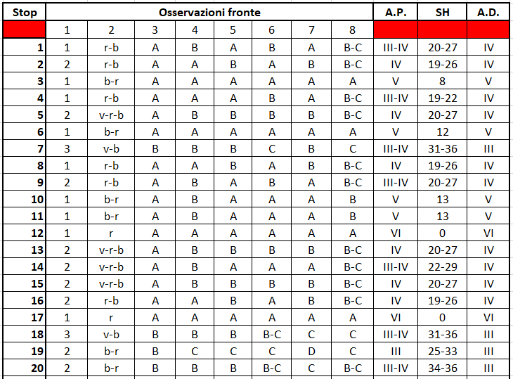 Durante l’attività di rilevamento, per ogni stop sono state effettuate le misure e le osservazioni; per la raccolta di questi e la scelta riguardante l’attribuzione dei pesi relativi, si utilizza la scheda mostrata di seguito (Tab. 4.6).