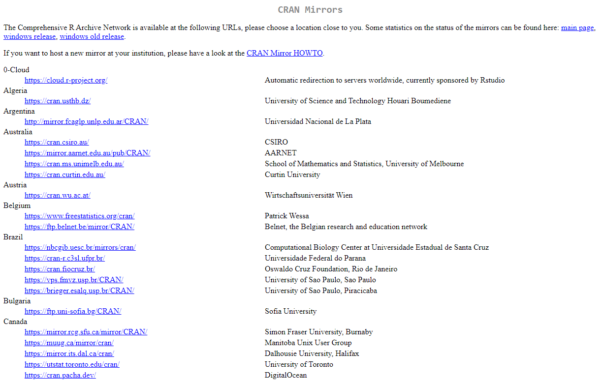 - This will direct you to a page titled “CRAN Mirrors”. On this page, find the geographic location closest to you and click the corresponding link.