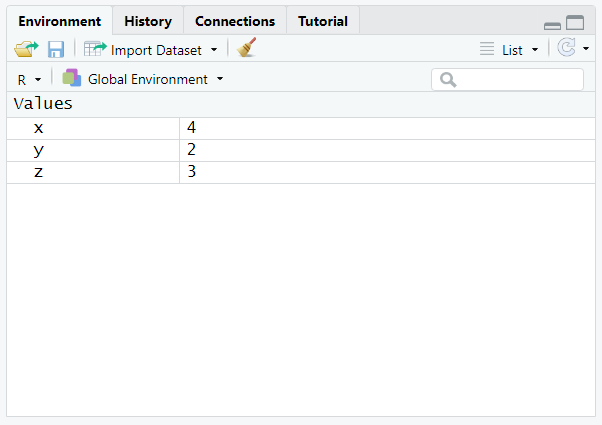 In the Environment tab, you can see the objects that exist within your working environment. So far we have created objects called x, y, and z, so we see these in the Environment tab: