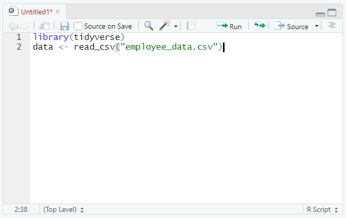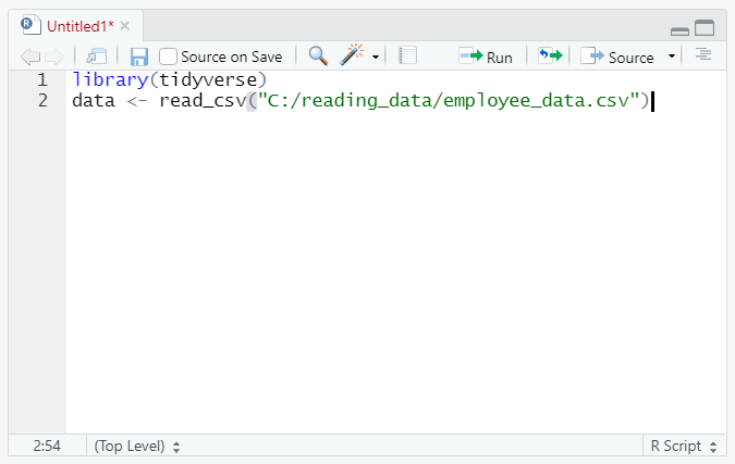 To read in data from a file, save the file on your computer and note the full file path. For example, imagine we would like to read in “employee_data.csv”, which is stored in the directory “C:/reading_data”. To read this into RStudio, we need to pass the full file path to the read_csv() function from the tidyverse package. Note that the file path needs to use forward slashes (/); you will get an error if you use backwards slashes (\).