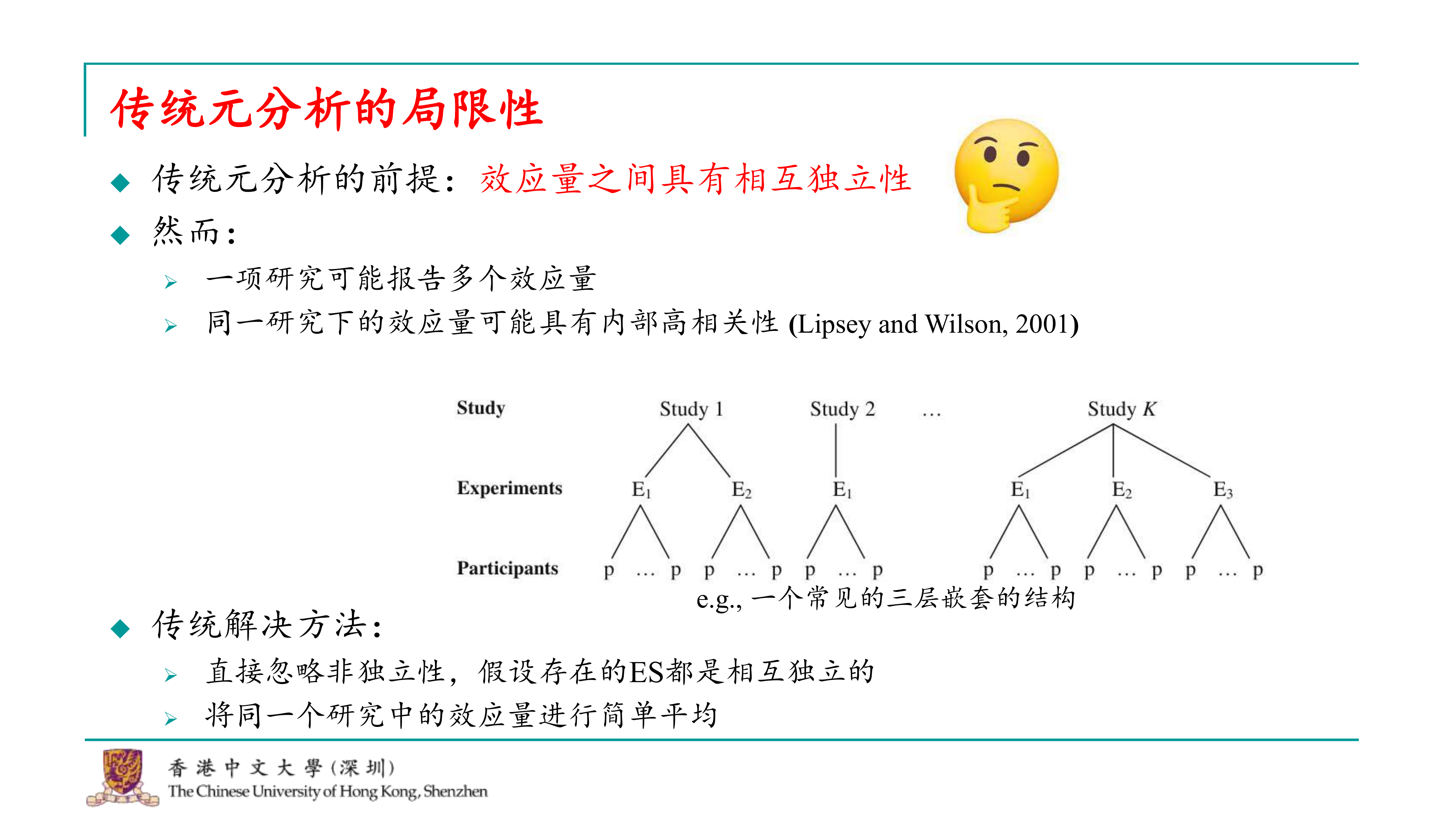 确实,学界正在探索和改进元分析的方法,以更好地处理和分析嵌套数据结构。这种改进的方法与层次模型(hierarchical model)有相似之处,都涉及到将数据的方差分解为不同的层级。 在传统的元分析中,数据的方差通常被分解为抽样方差和研究间方差。然而,对于嵌套数据结构,如多个效应量来自同一研究,我们需要考虑研究内的方差。这种三水平元分析(three-level meta-analysis)的方法现在越来越流行,因为它能够更准确地反映数据的真实结构,从而提高元分析结果的可靠性。 三水平元分析的方法将元分析的数据结构分为三个层级: 1. 第一层:不同的研究。 2. 第二层:每个研究内的不同效应量或测量。 3. 第三层:参与这些效应量或测量的个体。 这种方法允许研究者考虑不同层级之间的相关性,并使用更复杂的统计模型来估计效应量。通过这种方式,三水平元分析能够更准确地处理嵌套数据,从而提高元分析结果的准确性和严谨性。