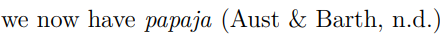 如例子中(Aust and Barth, n.d.),这是papaja的引用格式,包含中括号[]、@符号以及参考文献标识。参考文献标识为.bib文件中@后面的内容。这种标识转换后为APA标准引用,以括号的形式引用文献。