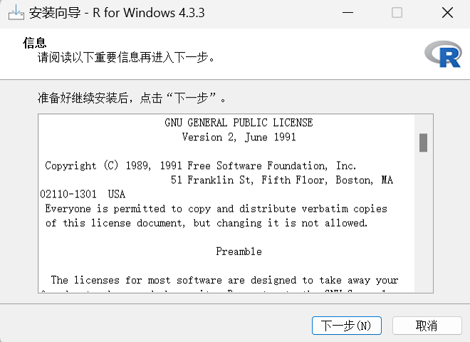 一般来说,现在大部分计算机都是64位比特的CPU,所以安装64位的R就足够了。安装时全部采用默认选择,安装完成后,你就可以看到下面这个界面。安装时我会选择默认的安装路径,同时确保路径中没有中文名称。完成后,我们会看到R的Logo,点击它就可以打开R的界面。