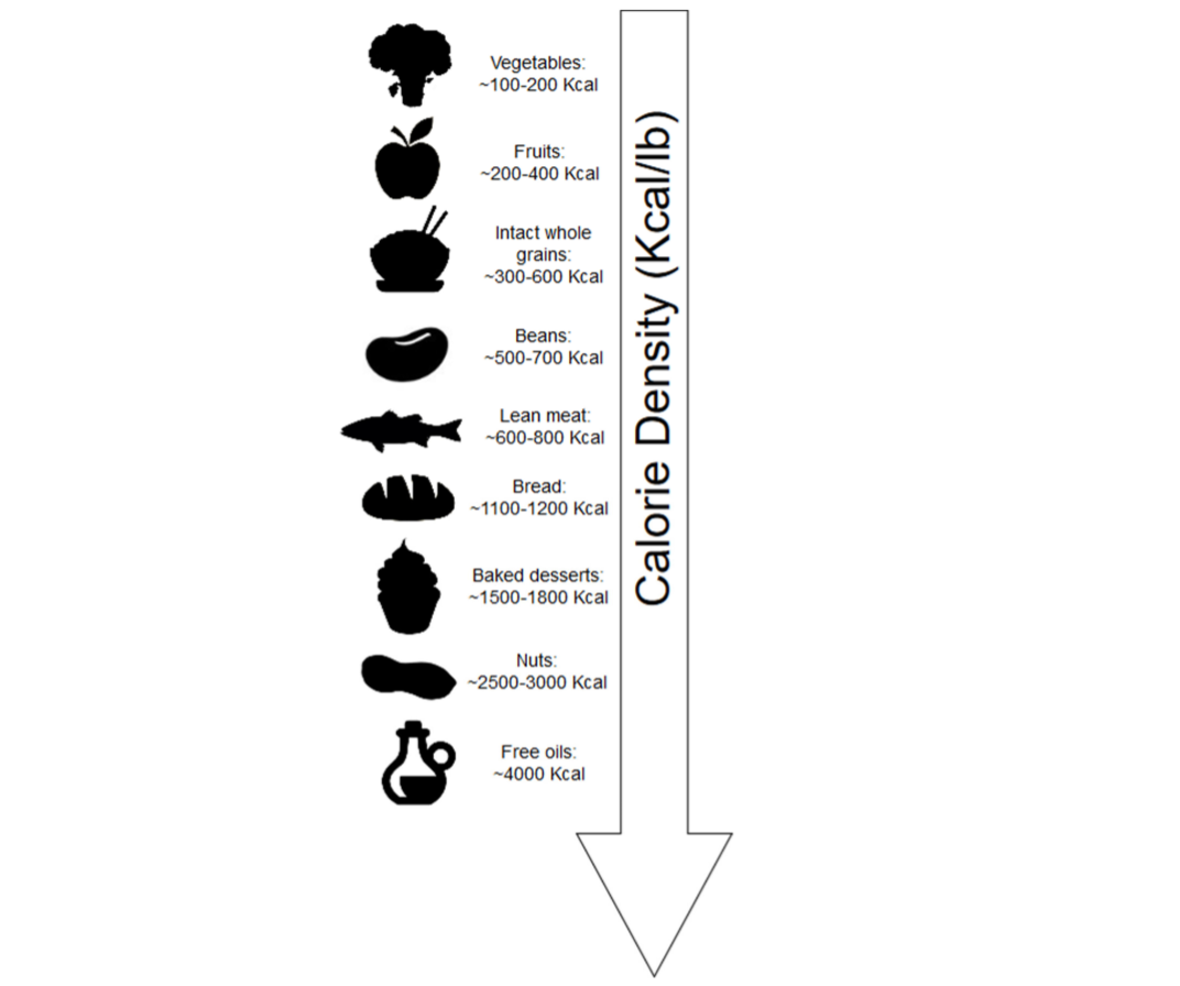 Densidad calórica promedio de los alimentos en kcal / lb. “Los alimentos con mayor contenido de agua y fibra suelen ser más diluidos en calorías. Los alimentos secos, los alimentos con menos fibra y / o los alimentos con mayor contenido de grasa son más densos en calorías” (4).