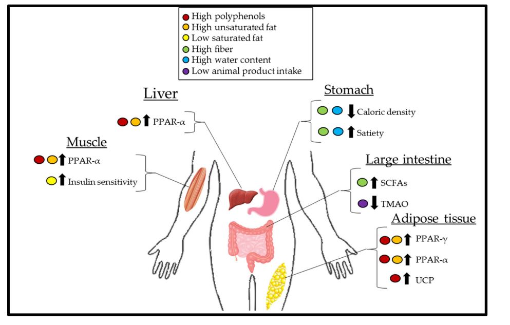 “Efectos fisiológicos de una dieta basada en plantas y la interacción de los sistemas de órganos en el contexto de la pérdida de peso. Los polifenoles y los ácidos grasos insaturados pueden actuar sobre los músculos, el hígado y el tejido adiposo para regular al alza la expresión del receptor activado por proliferador de peroxisomas (PPAR) -α, que aumenta la oxidación β y conduce a una reserva circulante reducida de ácidos grasos libres (FFA), disminuyendo así la disponibilidad. de FFA para la captación e hipertrofia del tejido adiposo. Además, los polifenoles y los ácidos grasos insaturados pueden actuar sobre el tejido adiposo para aumentar la expresión de PPAR-γ, lo que da como resultado la captación de FFA por el tejido adiposo, lo que reduce aún más la reserva de FFA. Un grupo reducido de FFA mejora la sensibilidad a la insulina y conduce a una mayor termogénesis debido a una mejor manipulación de la glucosa. Un menor consumo de grasas saturadas, que se derivan principalmente de alimentos de origen animal, mejora aún más la sensibilidad a la insulina. Los polifenoles también actúan sobre las proteínas de desacoplamiento (UCP) dentro de las mitocondrias, aumentando la termogénesis. Los alimentos de menor densidad calórica, debido a que son más altos en fibra y agua, a menudo consumen más volumen del estómago que los alimentos densos en calorías, lo que lleva a una reducción general de la ingesta calórica y a una saciedad temprana. El aumento de la síntesis de ácidos grasos de cadena corta (AGCC) a partir de la fermentación de la fibra debido a los microbios en el intestino aumenta las hormonas de la saciedad y retrasa el vaciado gástrico. Los microbios intestinales favorables resultantes de la disminución del consumo de productos animales disminuyen la síntesis de N-óxido de trimetilamina (TMAO). La disminución de TMAO aumenta la presentación de tejido adiposo beige más metabólicamente activo” (4).
