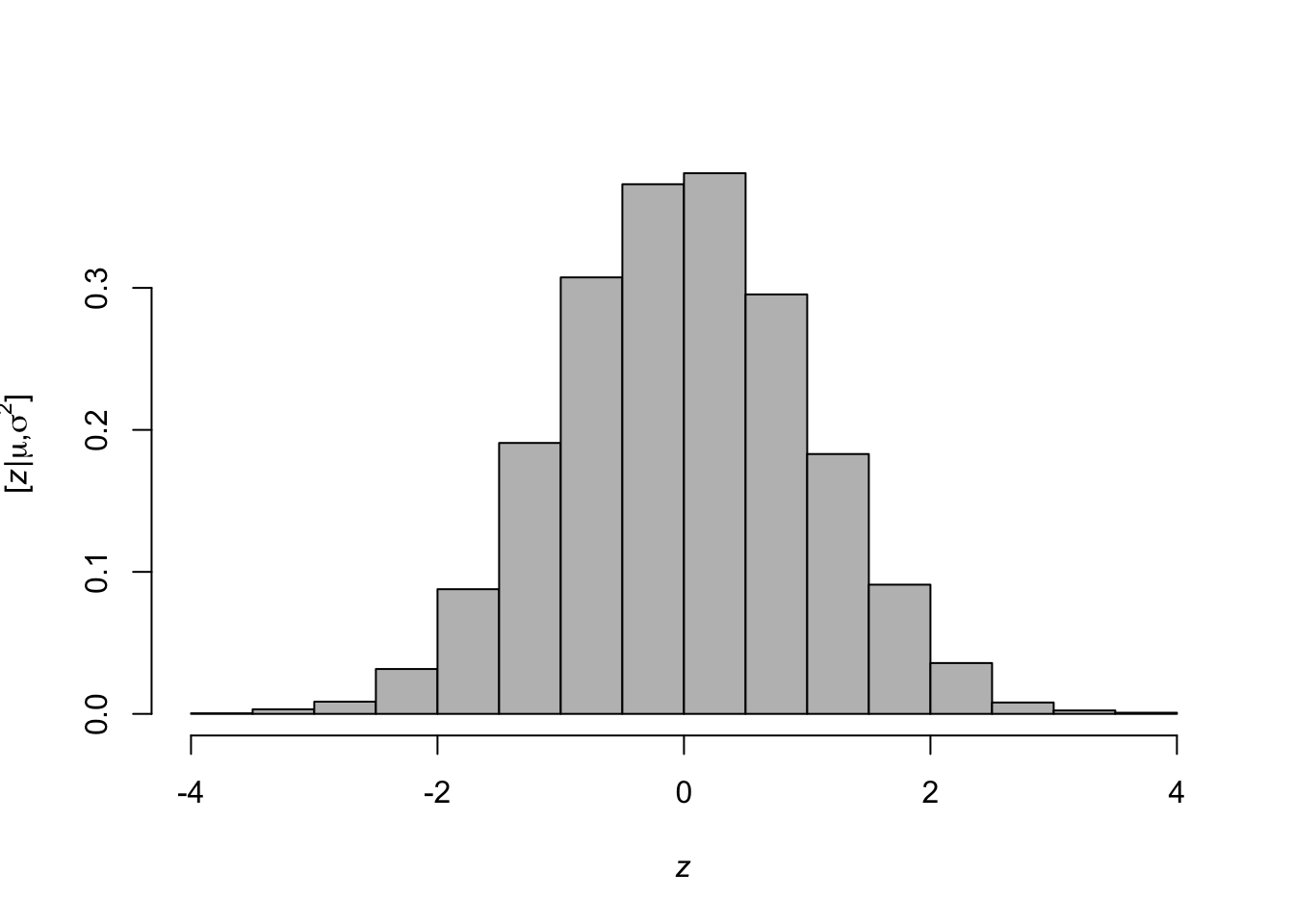 library(latex2exp) z <- rnorm(n = 10000, mean = 0, sd = 1) hist(z,freq=FALSE,col="grey",main = "", xlab= TeX('$\\mathit{z}$'), ylab = TeX('$\\lbrack\\mathit{z}|\\mu,\\sigma^2\\rbrack$'))