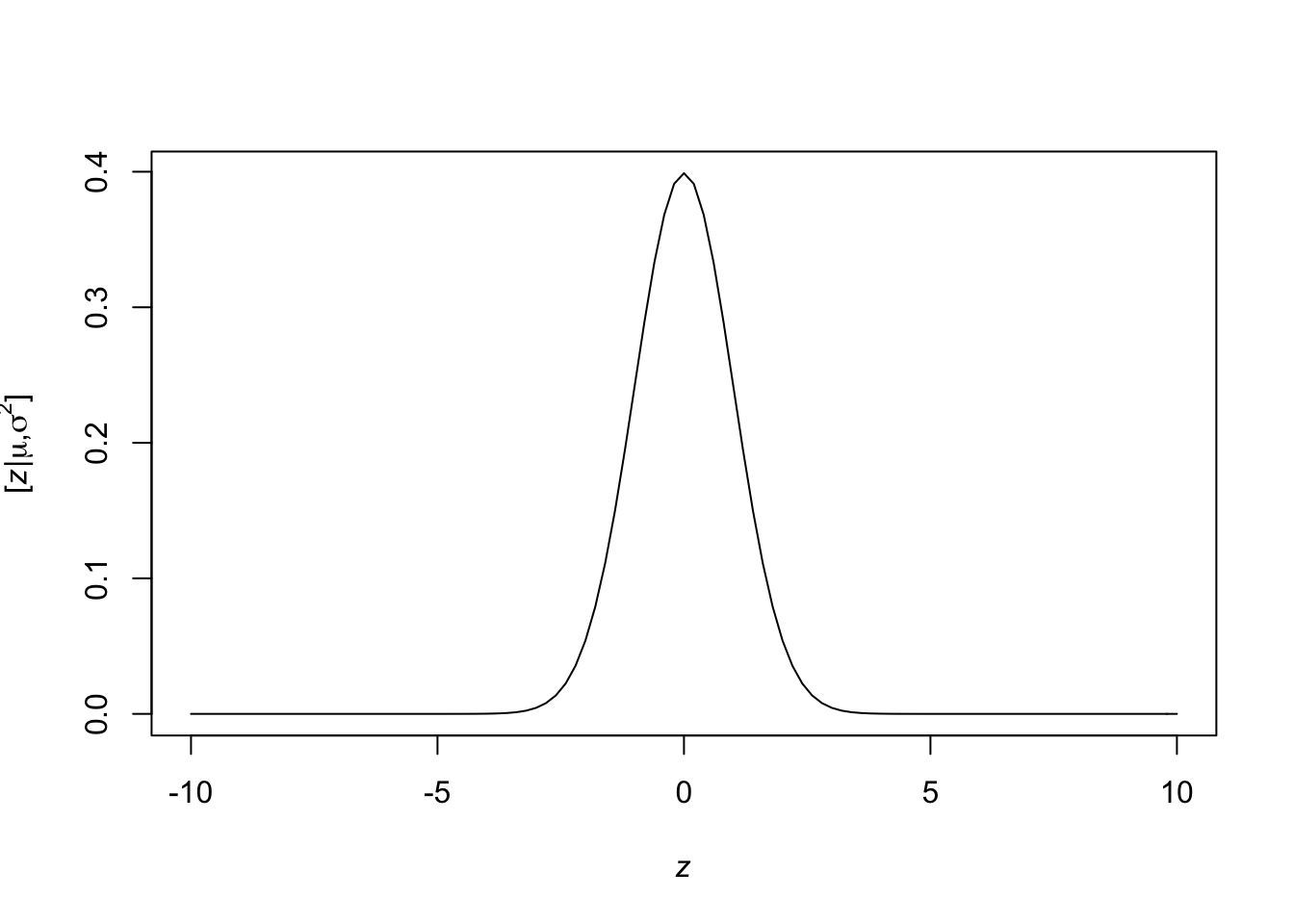 curve(expr = dnorm(x = x, mean = 0, sd = 1), from = -10, to = 10, xlab= TeX('$\\mathit{z}$'), ylab = TeX('$\\lbrack\\mathit{z}|\\mu,\\sigma^2\\rbrack$'))