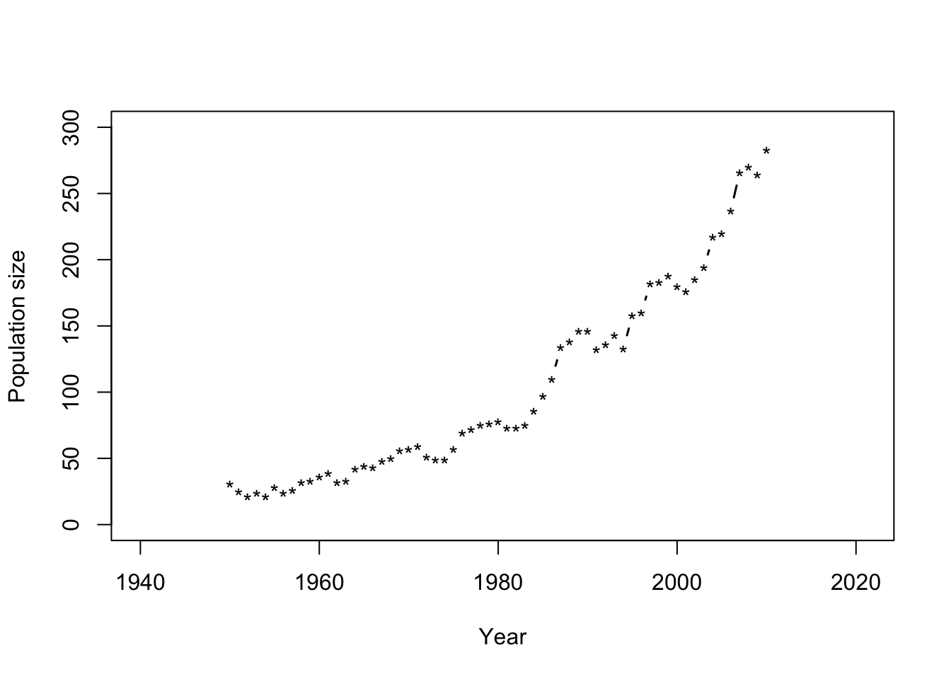 ## fit lwr upr ## 1 29.35980 21.43774 37.28186 ## 2 28.84122 21.42928 36.25315 ## 3 28.47610 21.54645 35.40575 ## 4 28.26444 21.78812 34.74075 ## 5 28.20624 22.15308 34.25940 ## 6 28.30150 22.64000 33.96300plot(df1$Winter, df1$N, xlab = "Year", ylab = "Population size", xlim=c(1940,2021),ylim = c(0, 300), typ = "b", lwd = 1.5, pch = "*") points(df1$Winter,Ey.hat[,1],typ="l",col="red") points(df1$Winter,Ey.hat[,2],typ="l",col="red",lty=2) points(df1$Winter,Ey.hat[,3],typ="l",col="red",lty=2)