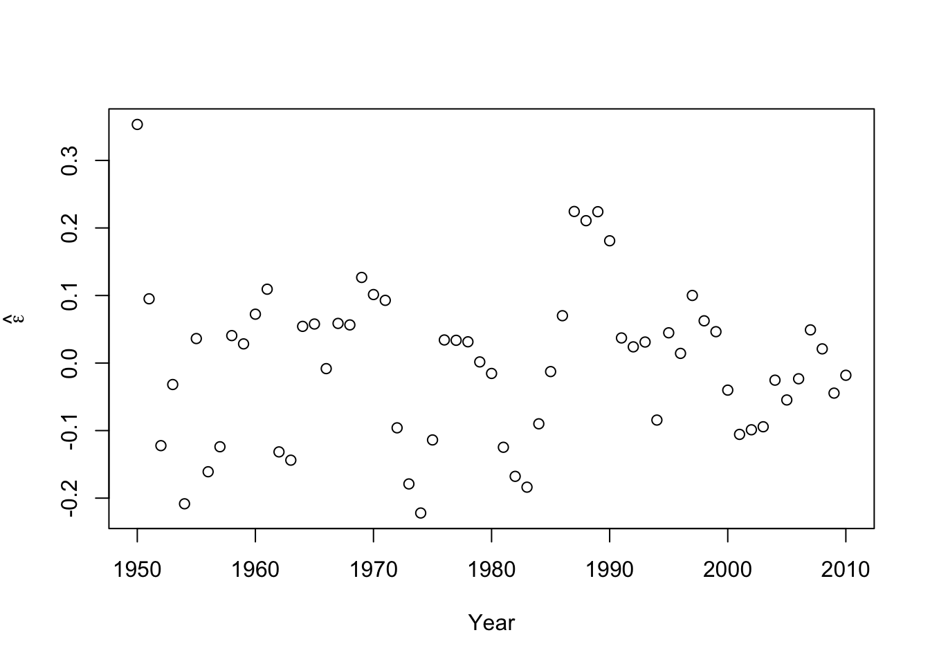 - Fit the model \(\mathbf{y}=\beta_{0}+\beta_{1}\mathbf{x}+\boldsymbol{\varepsilon}\) where \(\boldsymbol{\varepsilon}\sim\text{N}(\mathbf{0},\sigma^{2}\mathbf{I})\) and \(\mathbf{x}\) is the year.