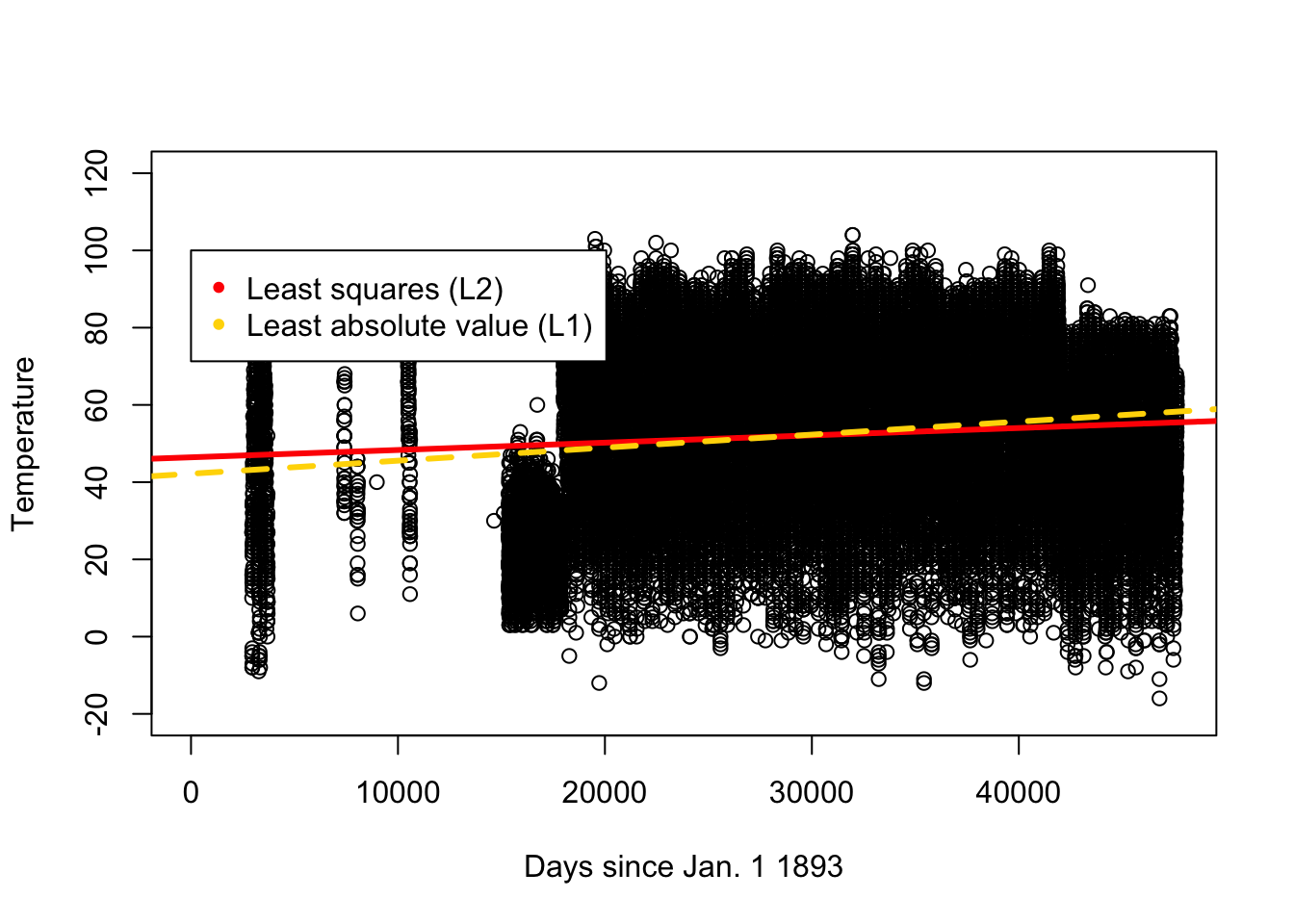 legend(0,100,legend=c("Least squares (L2)","Least absolute value (L1)"), col=c("red","gold"),pch=20)