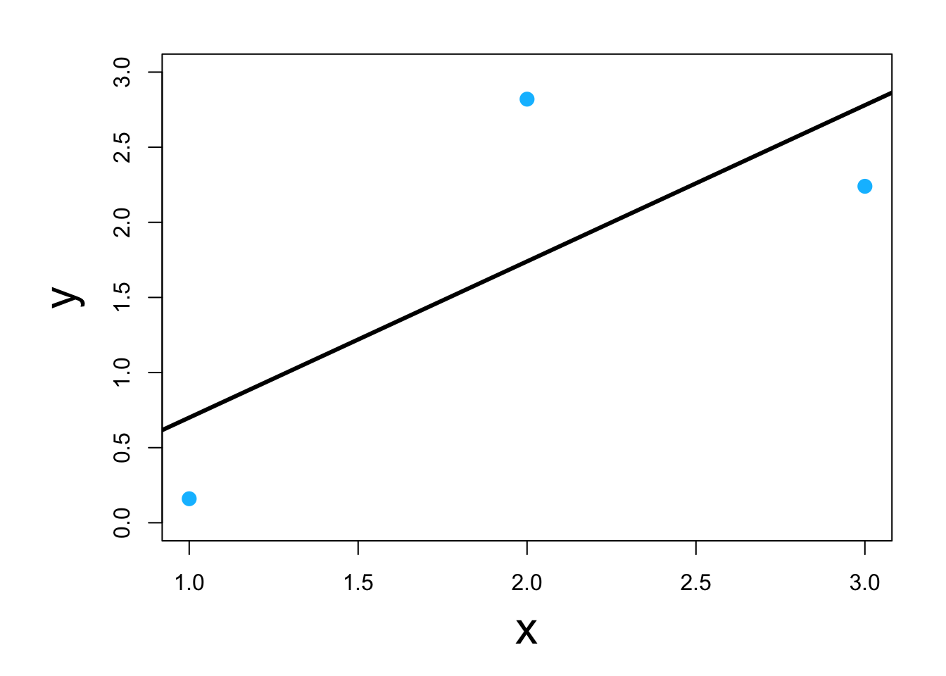 df <- data.frame(y = c(0.16,2.82,2.24),x = c(1,2,3)) lm(y~x,data=df)## ## Call: ## lm(formula = y ~ x, data = df) ## ## Coefficients: ## (Intercept) x ## -0.34 1.04 - Live example