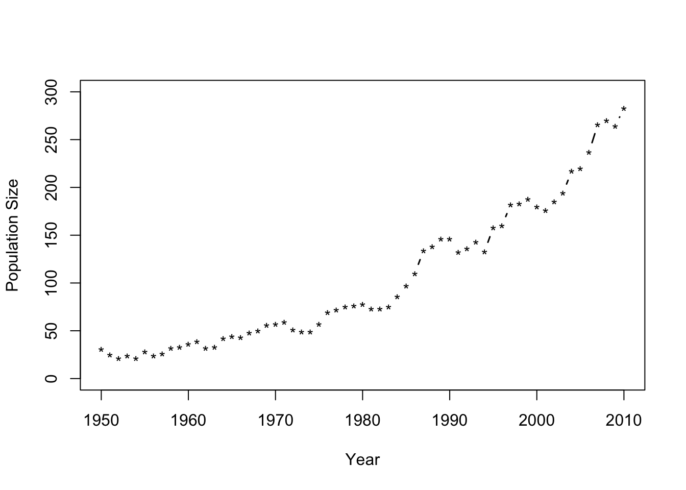 plot(df1$Winter, df1$N, xlab = "Year", ylab = "Population Size",