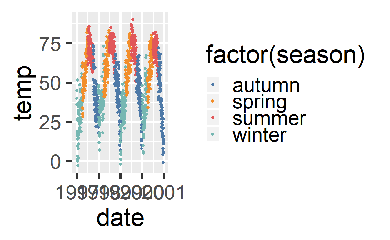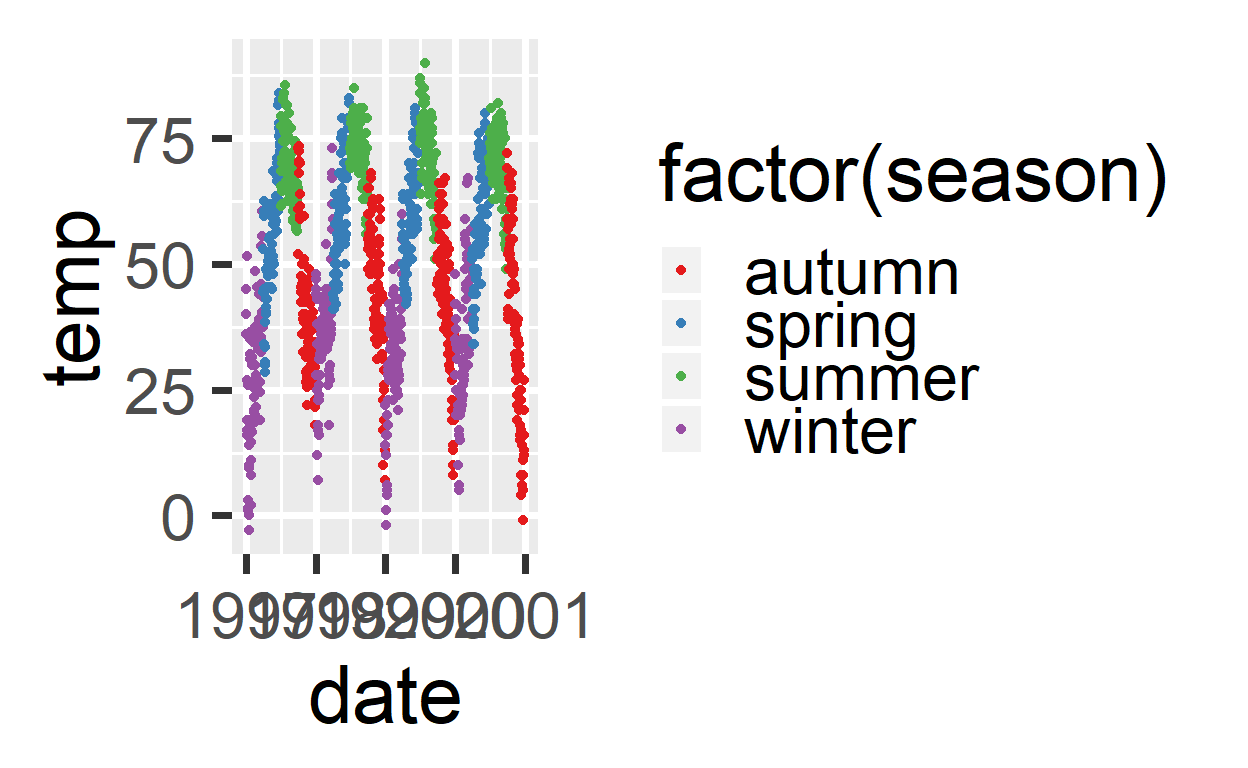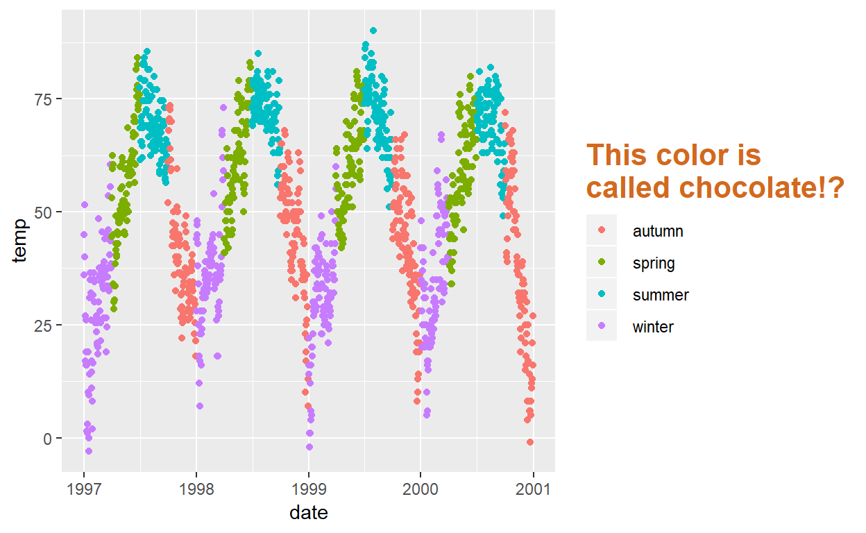 Bij categoriale variabelen kun je de kleur zelf aanpassen (scale_color_manual)