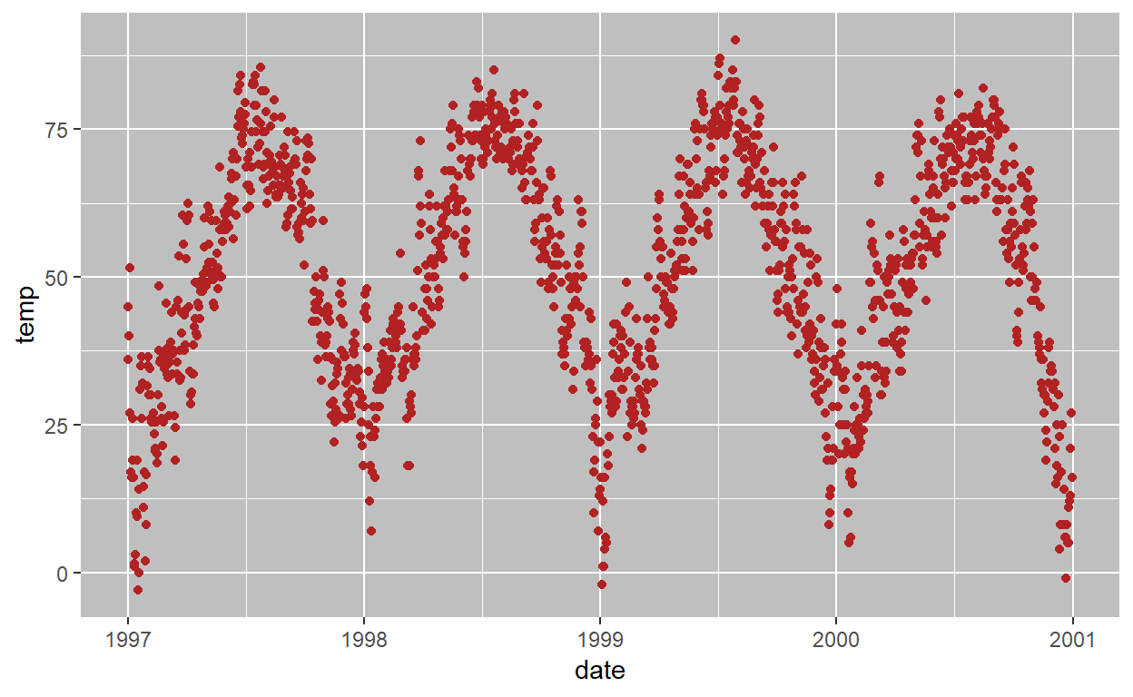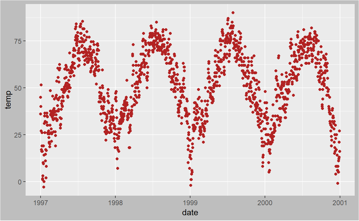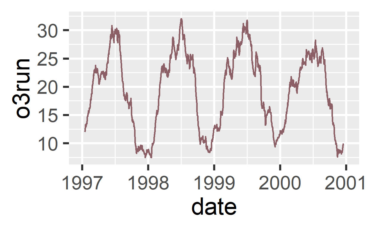Bekijk de dataset eerst goed. In dit geval gaat het om een data uit Chicago over luchtvervuiling over een aantal jaren. Het jaartal zit erin, het aantal doden per dag, de temperatuur, dan twee uitkomstmaten, het tijdstip en de seizoenen. Het zijn deze data die we zichtbaar gaan maken met het pakket ggplot van R.