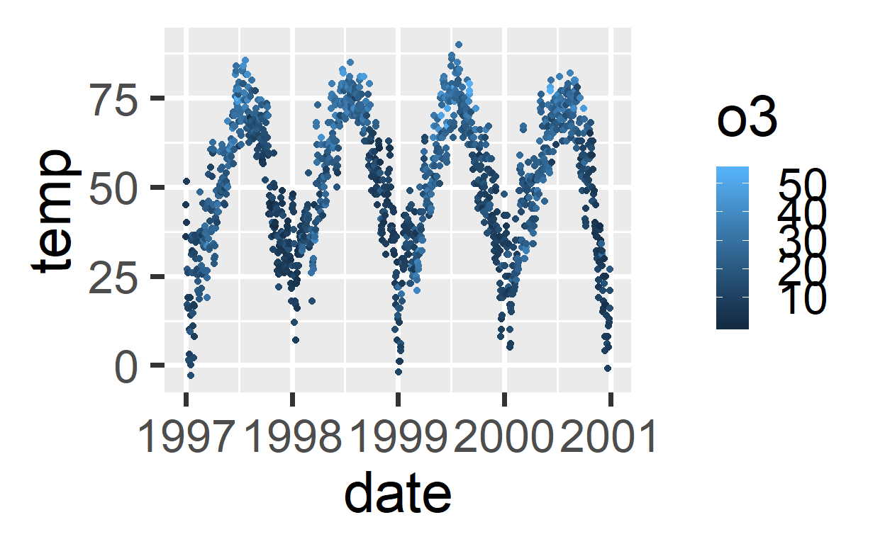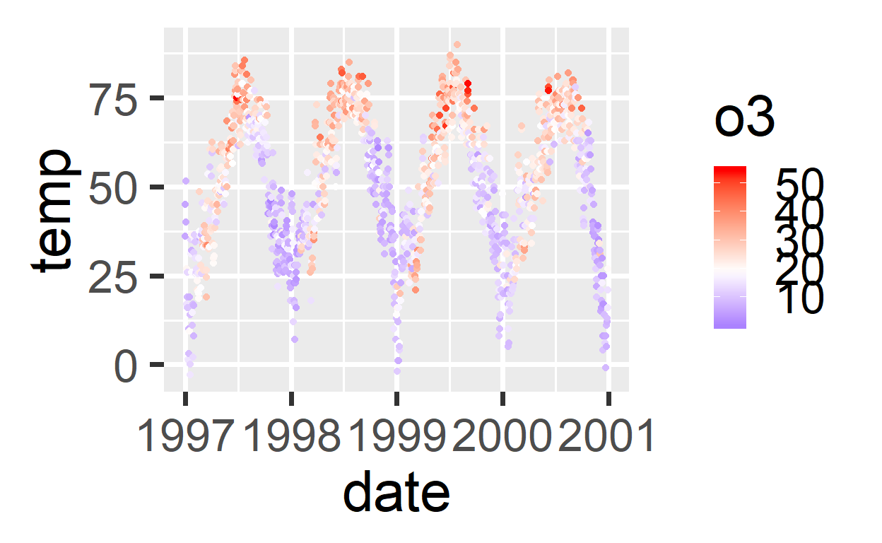 Bij continue variabelen kun je ook een kleurkeus gebruiken met een schaal (scale_color_gradient(), scale_color_gradient2())