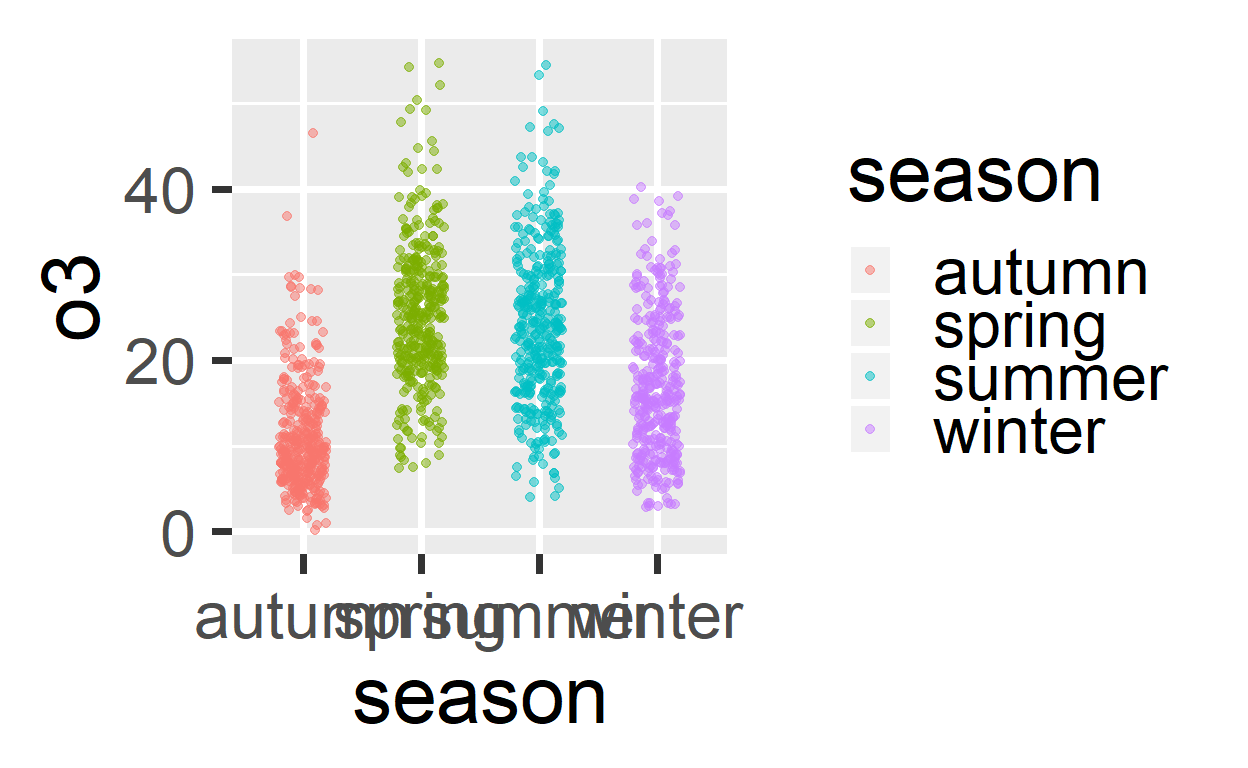 Het standaardfiguur is de volgende waarbij je aangeeft hoe de dataset in elkaar zit, naar welke variabelen je kijkt en wat je wilt zien. Let goed op, je ziet dat ggplot met duidelijke lagen werkt waar steeds passende commando’s bij horen.