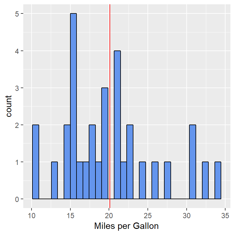 lm_mpg <- lm(mpg ~ wt, data = mtcars) # Run het lineair model dat mpg voorspelt op basis van wt