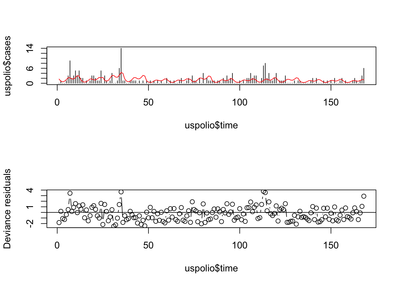 polio2.glm <- glm(cases~time + I(cos(2*pi*time/12)) + I(sin(2*pi*time/12))